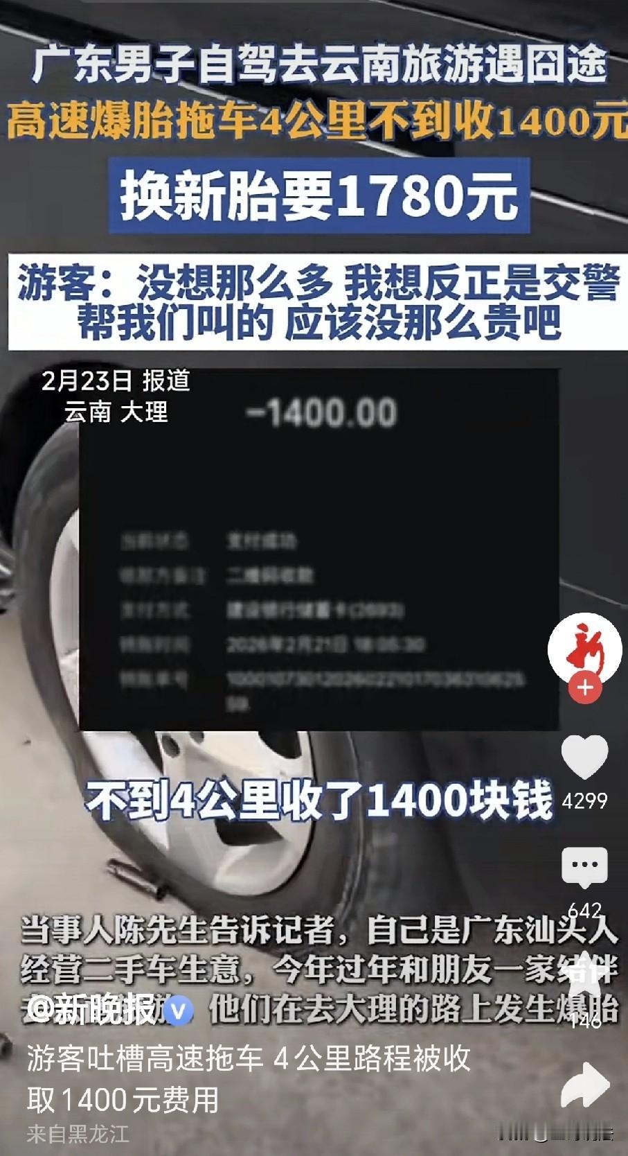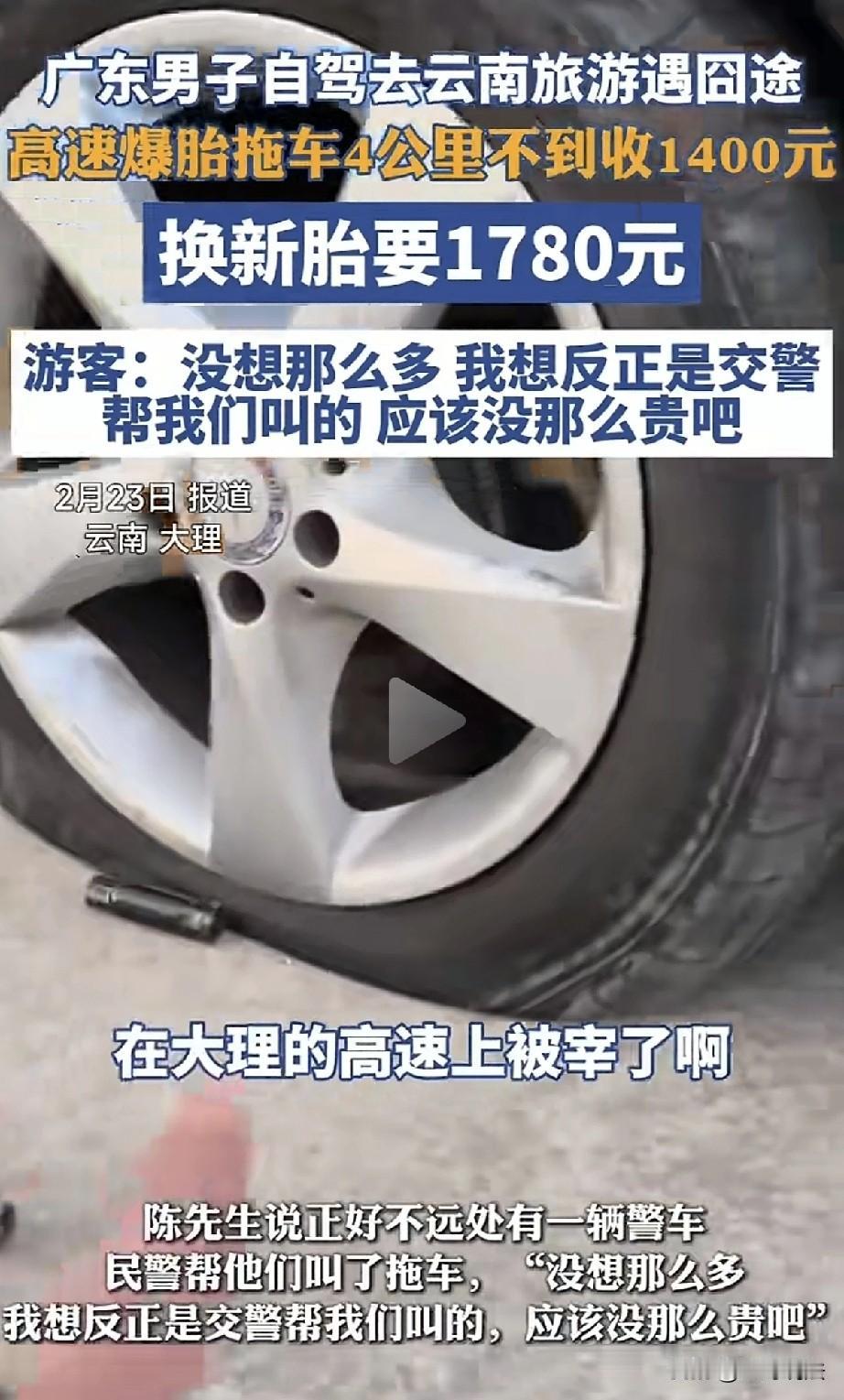 云南大理,一男子和朋友自驾游,高速上车胎爆了,民警帮他们叫了拖车,谁知不到4公里收了他1400元,换新轮胎1780元,男子被宰,越想越气: 这钱花的很烦,很不开心! 2月23日,广东汕头的陈先生跟朋友一家自驾去云南旅游,本想着一路欣赏美景,放松放松。 可没想到,一场意外让他很不开心! 陈先生做二手车生意的,平时就爱开着车到处游玩,这次过年,他约上朋友一家,打算去大理感受一下风土人情。 旅途上欢声笑语,大家对遥远的地方充满着向往,他们有说有笑,看着窗外的风景,满心期待着美好的旅程。 可谁能想到,当他们的车开到大理的高速,陈先生突然感觉车身一震,然后听到“砰”的一声。 车子有些失去了平衡,陈先生心想坏了,这是爆胎了的迹象! 他缓缓停下车来,大家也都赶忙下车帮他查看情况。 陈先生一看车况,果不其然就是车胎爆了,他心里发愁,这里前不着村后不着店,自己对这里完全的陌生。 他正琢磨着如何是好,突然看到不远处有一辆警车。 陈先生心想,这太好了,真是天无绝人之路,正好可以找警方给自己帮忙。 民警一看他们的情况,立刻帮他们叫了拖车。 陈先生当时也没多想,觉得反正是交警叫的,价格应该没那么贵吧。 拖车很快来了,把他们的车拖下来高速,可等结账的时候,陈先生傻眼了。 不到4公里的路程,居然收了他1400块钱!陈先生愣住,这也太贵了吧? 这还没完,拖车公司又叫人来补胎,陈先生交了300元,可补胎的压根就没来! 陈先生没了法子,只有自己找救援,可救援公司表示,他的情况只能换新轮胎,换胎收了他1780元。 陈先生气不打一处来,这拖车加换胎直接花了他三千多元! 陈先生越想越气,他自己本身就是做二手车生意的,平时的拖车换轮胎价格多少他十分的熟悉。 他没有想到,自己还会因为这个被宰了,他不由得发出了感慨: 在大理的高速上被宰了啊,这钱花得我特别烦,特别不开心!” 原本好好的旅行,因为这次爆胎和“天价”救援,大家顿时就没了兴致。 陈先生更是越想越气,他觉得不能就这么算了,一定要讨个说法。 他拍了视频,发布自己的经历,这趟云南自驾游,因为这意外的一笔,变得有些糟心。 视频发出,顿时引起热议。 有人表示,一个大男人如果连一个备胎都不会换,被人宰是不冤枉的,我几年前开货车在高速上断了散热风扇皮带,都是我自己换的(车上有备用皮带,一早就预估有这种情况,所以一早就备好了),我从来没换过这个皮带,本来想找高速救援的,问了价钱实在是太贵了,就在路边自己动手把皮带换上了,给自己省了一千多块钱。 可是,你没有想到,并不是所有车都有备胎,也并不是所有人都有很强的动手能力的。 也有人说,为啥不叫保险公司来拖车? 立刻有人做出回复: 保险公司不能上高速拖车。 更有人说,浙江省境内的高速公路上拖车就是免费的,但免不免费不是重点,重点是高速公路上拖车的收费标准,是哪个部门核算出来的,核算的依据又是什么。不能你说多少就是多少,这不就成了趁人之危,落井下石了么? 陈先生云南自驾游,本满怀期待,却因爆胎,拖车换胎,三千多元就这么没了。 陈先生旅行兴致全无,实在闹心,这背后,反映是什么? 从商家来看,是诚信的缺失,拖车不到4公里收1400元,补胎收了钱却不见人,换新胎要价1780元,明显是坐地起价、宰客坑人。 商家利用游客身处异地、孤立无援的处境,肆意抬高价格,只图眼前利益,不顾长远口碑。 这种短视行为,不仅损害了游客权益,也破坏了当地旅游形象。 希望监管部门能加强巡查,对不合理收费进行及时查处。 其实,陈先生的遭遇不是个例,旅游市场宰客现象时有发生,严重影响了游客体验和旅游行业发展。 商家应明白,诚信经营才是长久之道,靠宰客只能一时获利,最终会被市场淘汰。 监管部门更应加大监管力度,畅通投诉渠道,让游客有苦能诉、有冤能伸。 希望陈先生的经历能引起重视,也希望当地能加强监管力度,让游客不再为此烦恼,真正享受旅行的快乐。 对此,你怎么看?