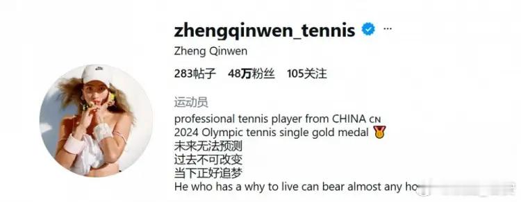 郑钦文取关里巴教练2月24日讯 根据郑钦文个人ins信息,她取关了教练里巴。郑钦文与里巴的合作关系已持续数年,不过根据郑钦文个人ins的最新情况,她已经取关了里巴。与此同时,郑钦文也更换了社媒头像。在个人ins简介一栏中,郑钦文还增加了一句尼采的名言:He who has a why to live can bear almost any how(一个人知道自己为什么而活,就可以承受任何一种生活)。