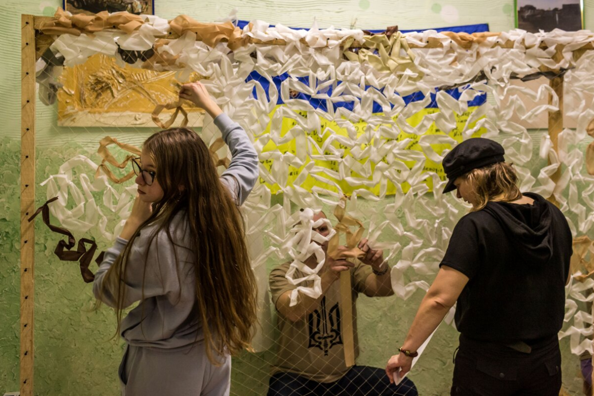 2022 年 2 月 6 日,乌克兰基辅,志愿者为乌克兰东部的士兵制作伪装网。