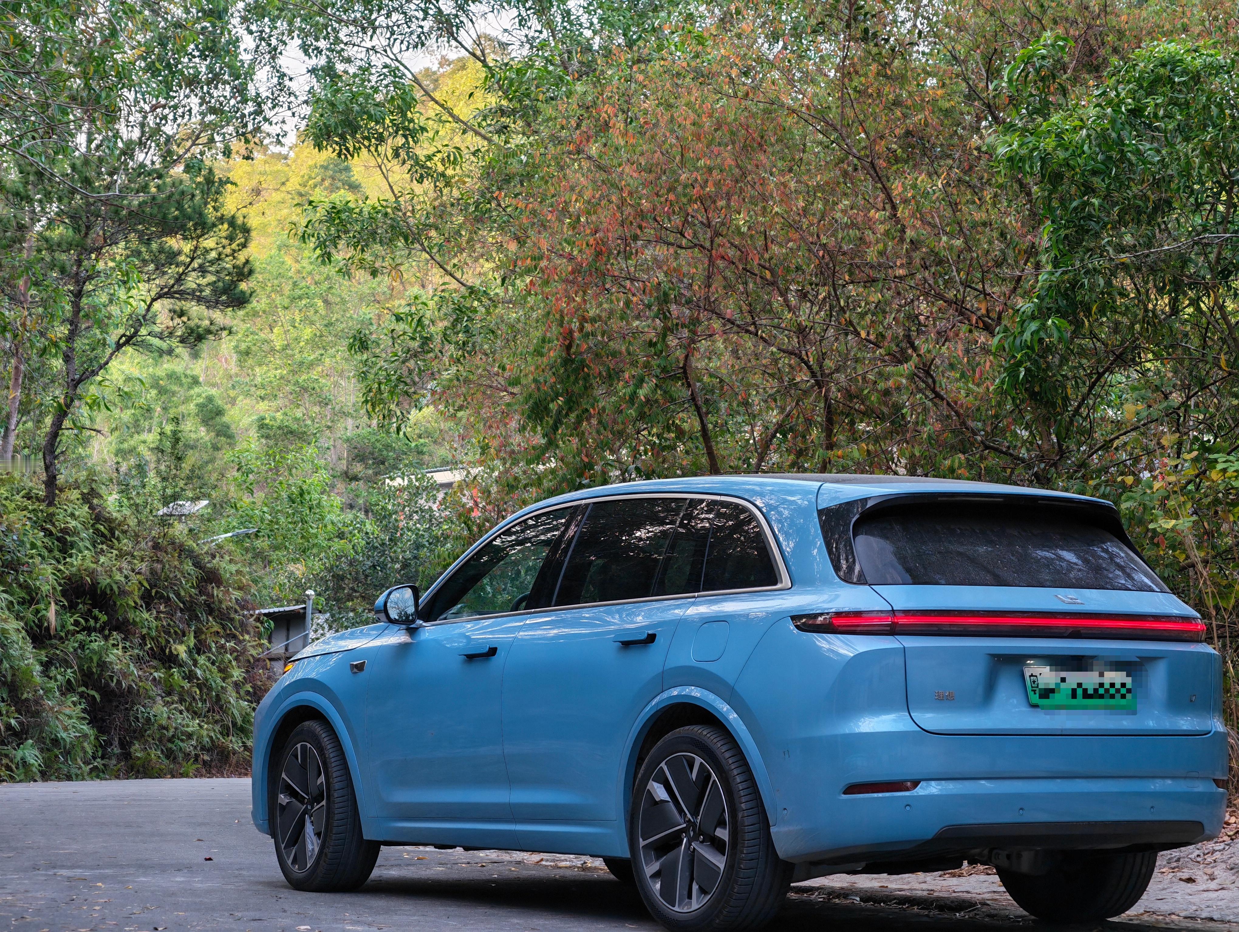 新款理想 L7 的宝宝蓝,不是那种扎眼的亮蓝,也不是深沉的海蓝,而是像婴儿连体衣那种奶乎乎的蓝。阳光下透着一点白,阴天时又泛起淡淡的灰,怎么看都舒服。