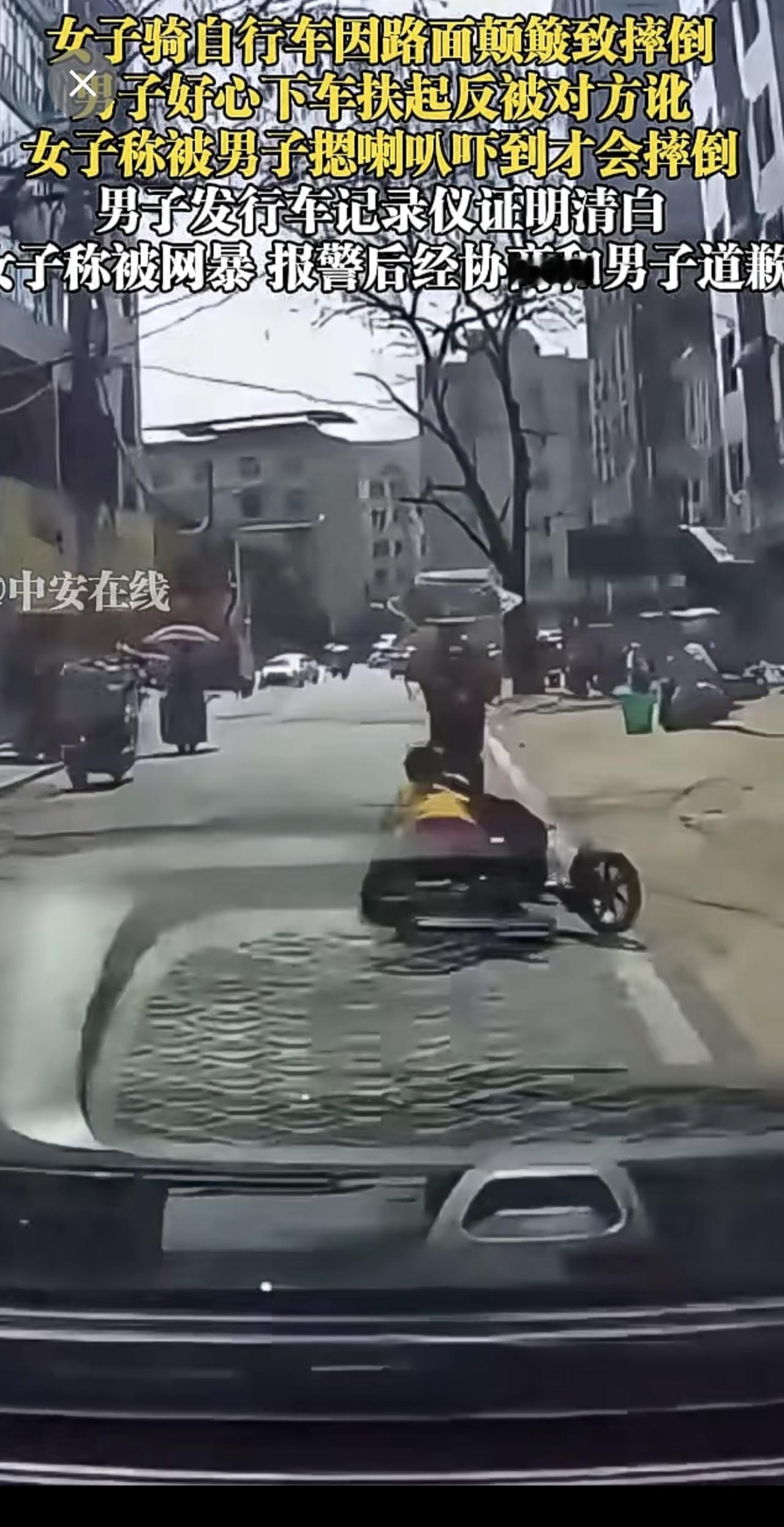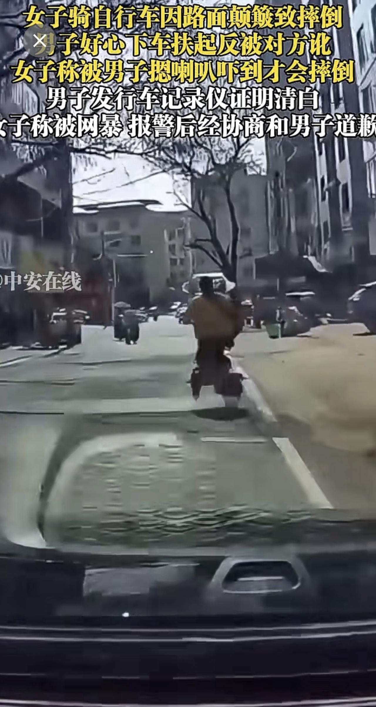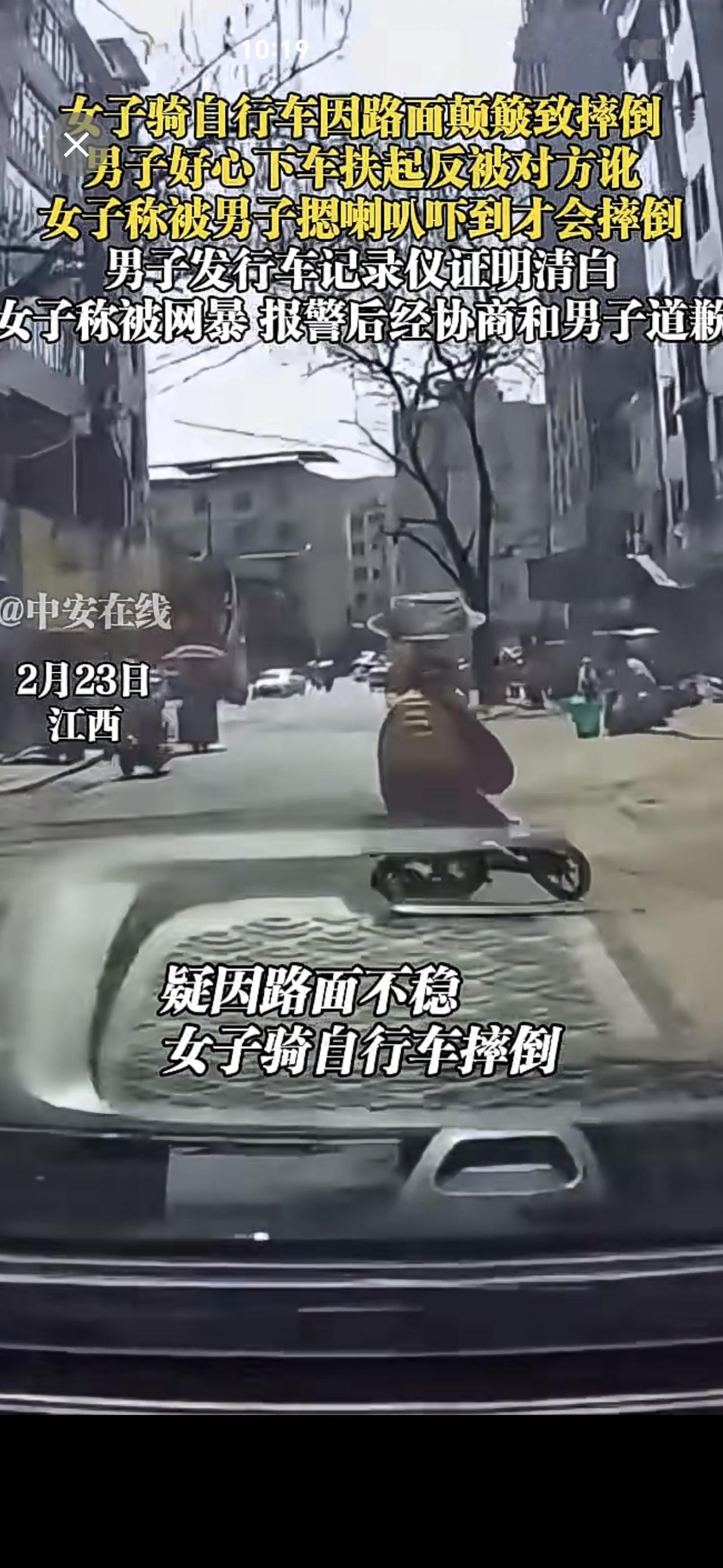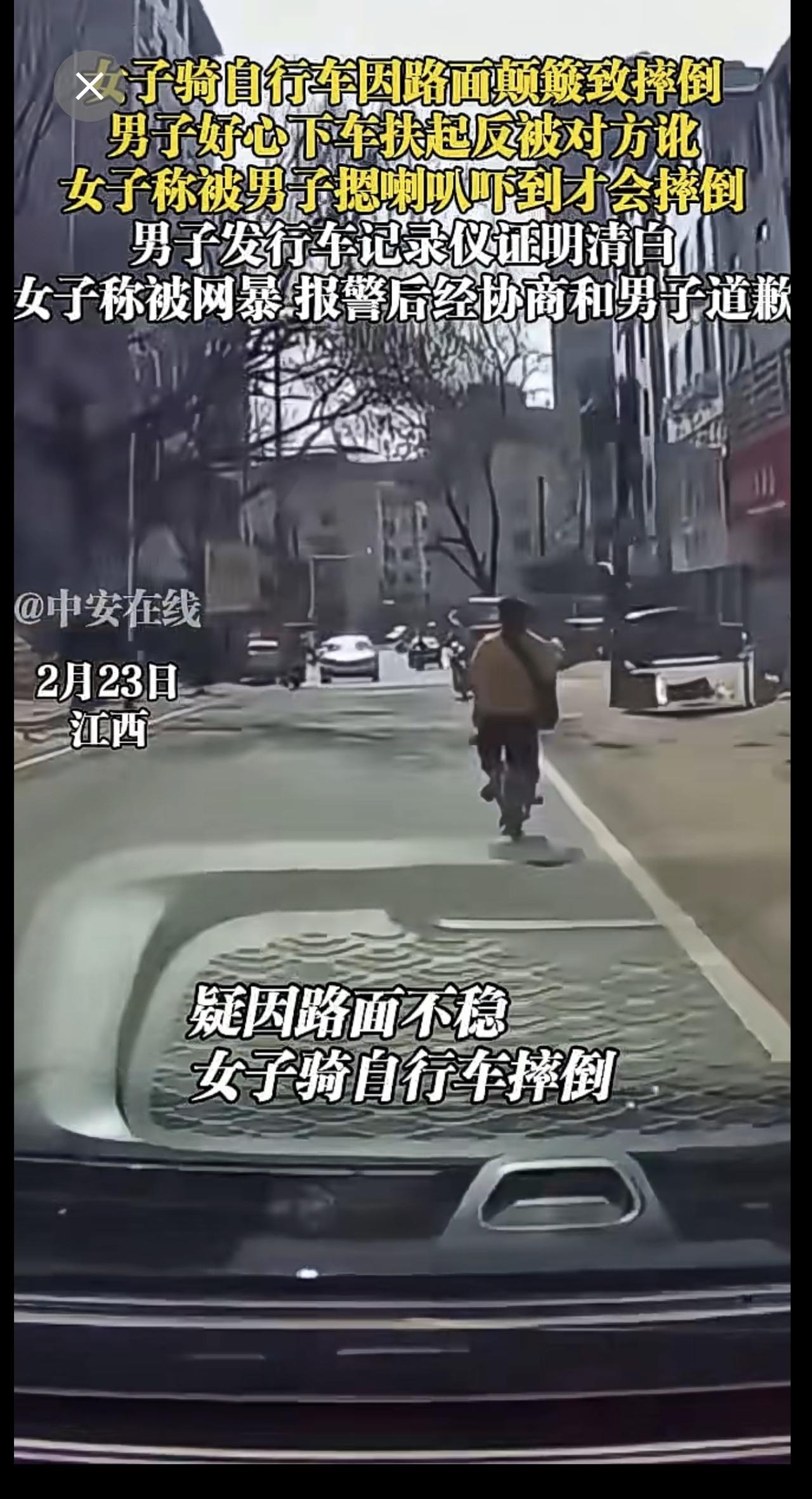 2月23日,江西萍乡。女子骑自行车因路面颠簸致摔倒,男子好心下车扶起反被对方讹,女子称被男子摁喇叭吓到才会摔倒,男子发行车记录仪证明清白,女子称被网暴,报警后经协商和男子道歉 无接触事故 行车记录仪 清白 (陈三多)@中安在线