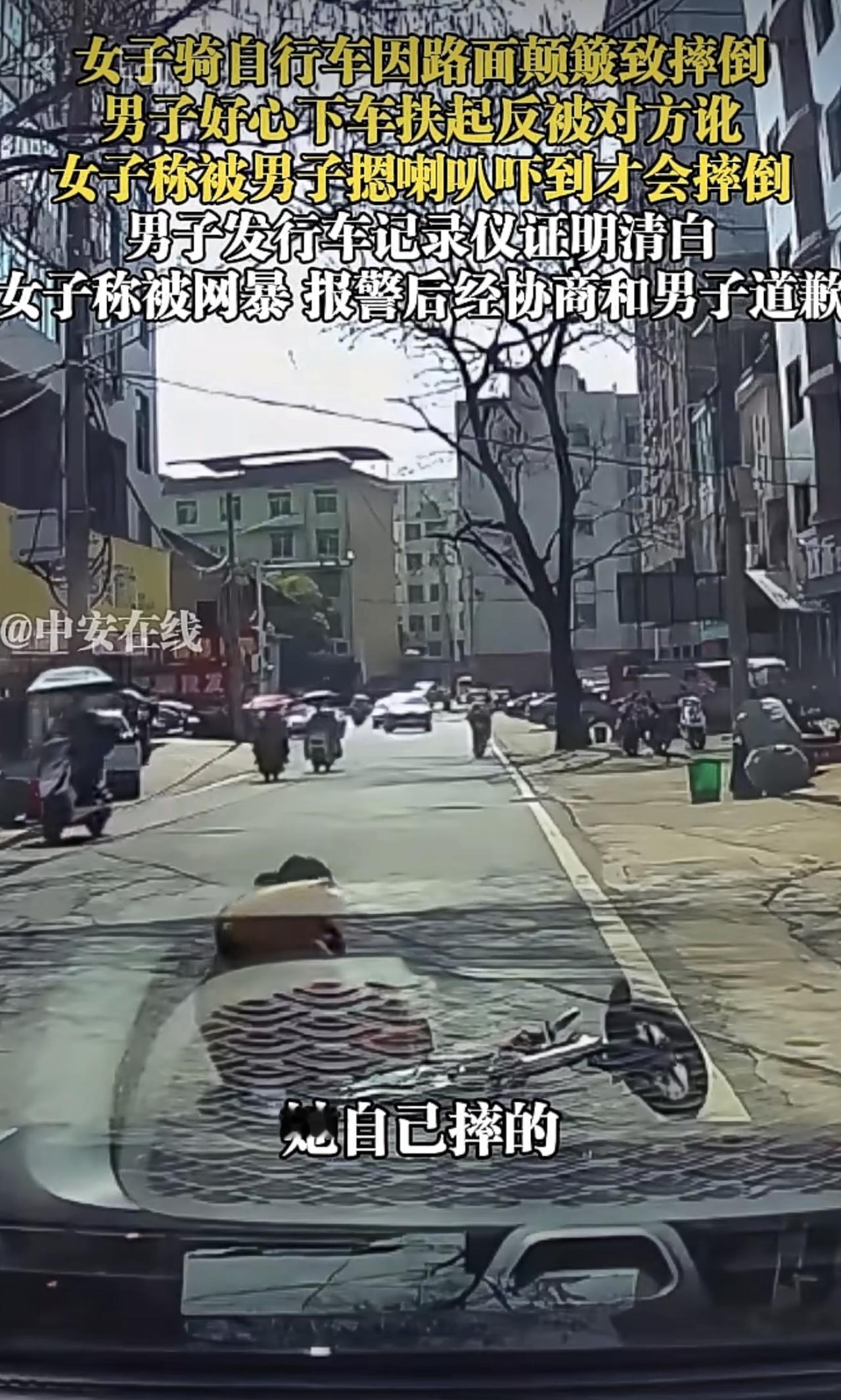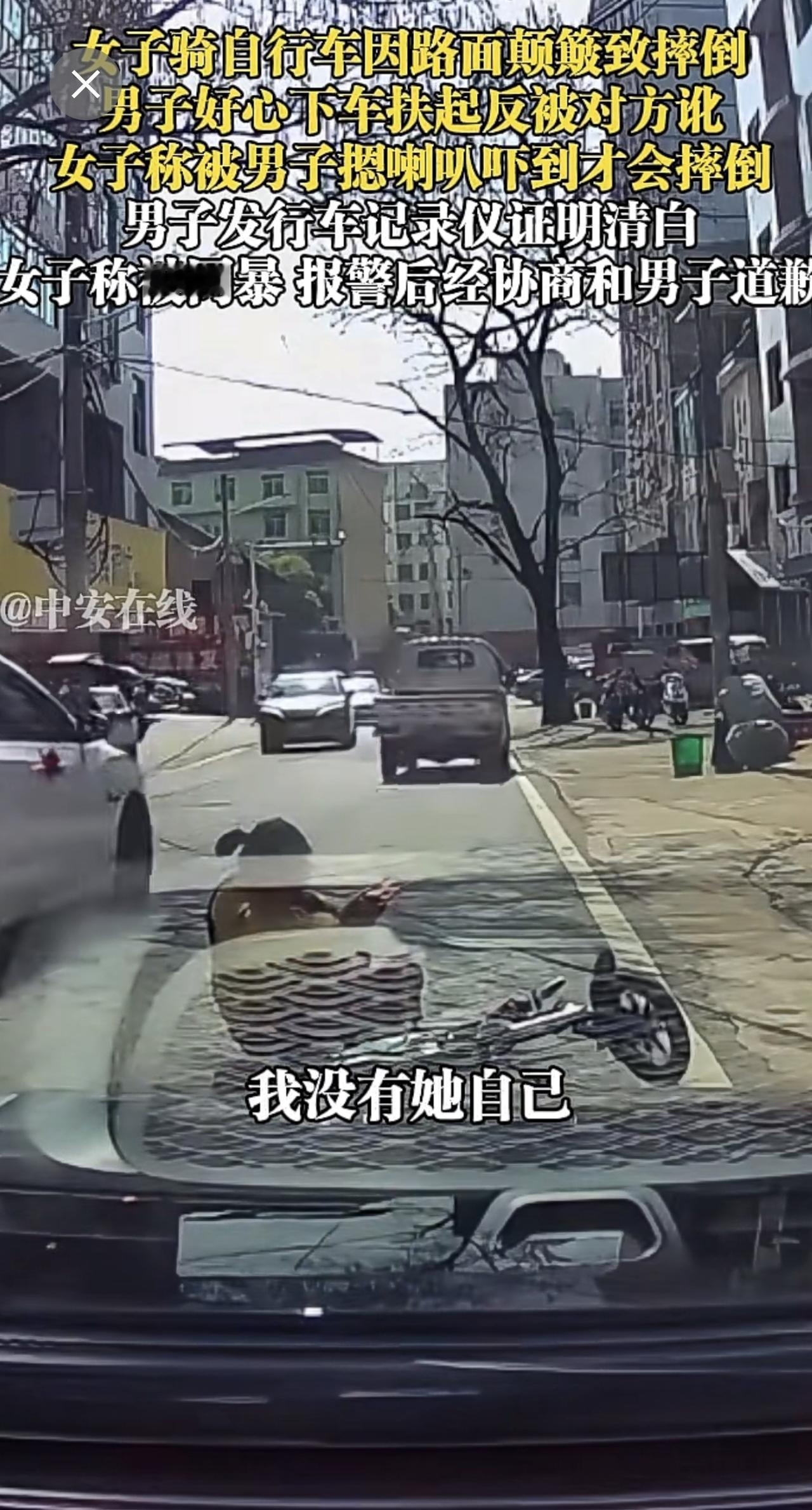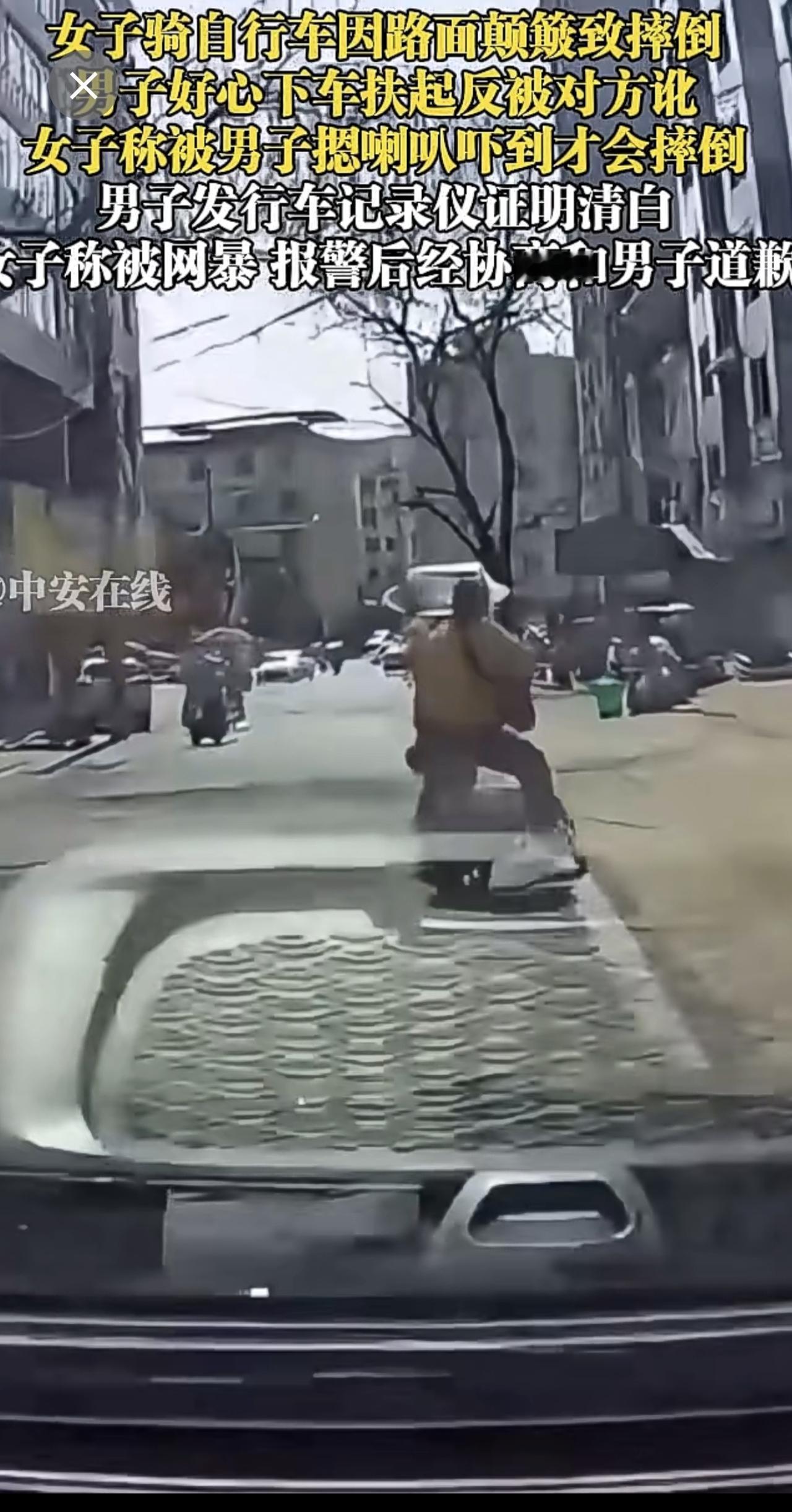 2月23日,江西萍乡。女子骑自行车因路面颠簸致摔倒,男子好心下车扶起反被对方讹,女子称被男子摁喇叭吓到才会摔倒,男子发行车记录仪证明清白,女子称被网暴,报警后经协商和男子道歉 无接触事故 行车记录仪 清白 (陈三多)@中安在线