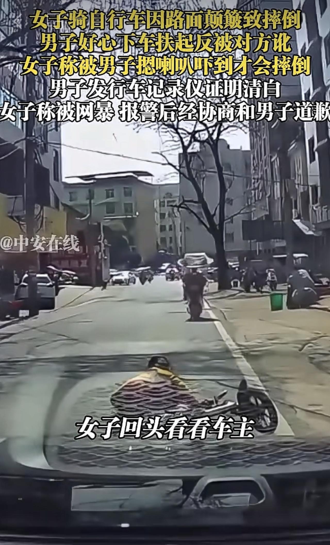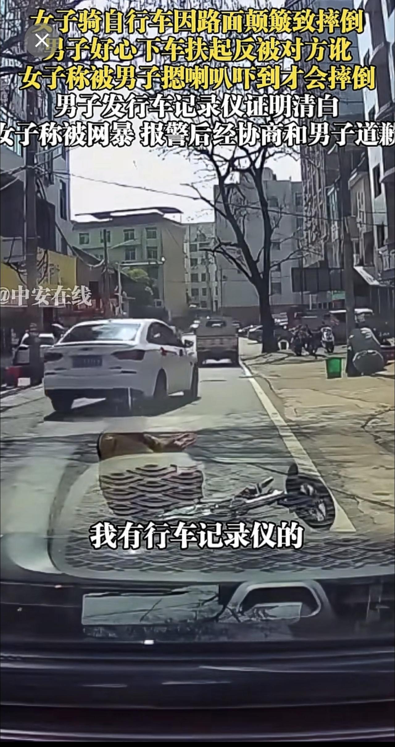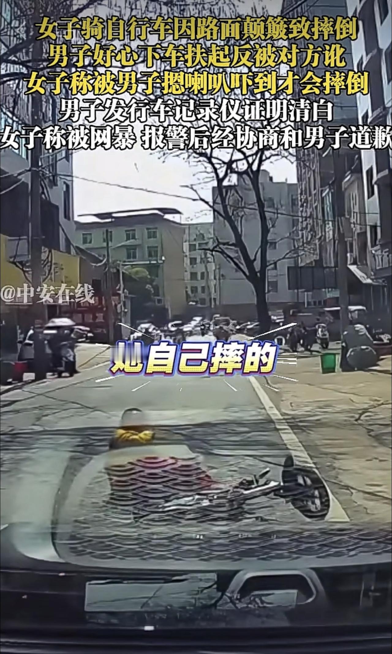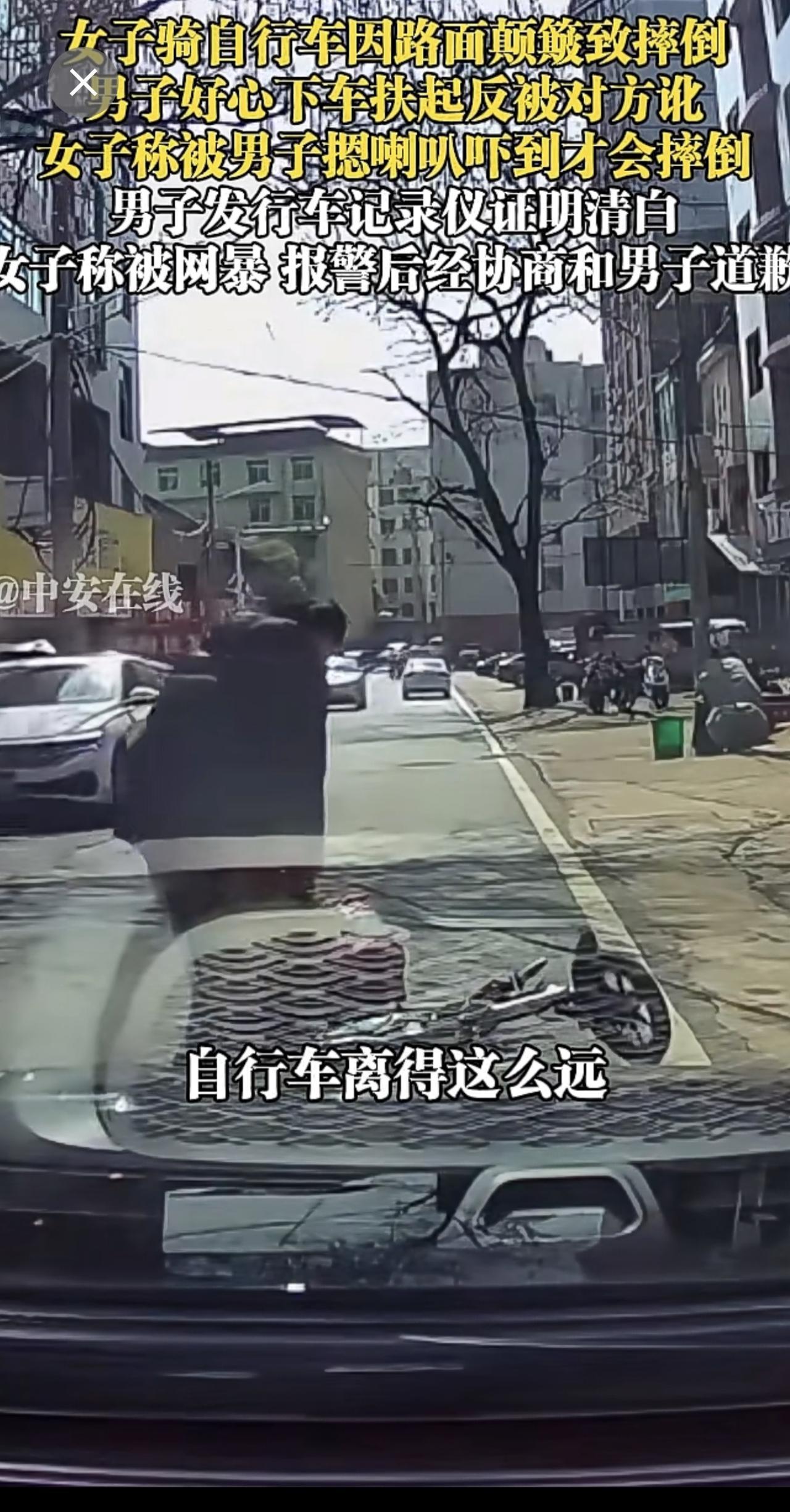 2月23日,江西萍乡。女子骑自行车因路面颠簸致摔倒,男子好心下车扶起反被对方讹,女子称被男子摁喇叭吓到才会摔倒,男子发行车记录仪证明清白,女子称被网暴,报警后经协商和男子道歉 无接触事故 行车记录仪 清白 (陈三多)@中安在线