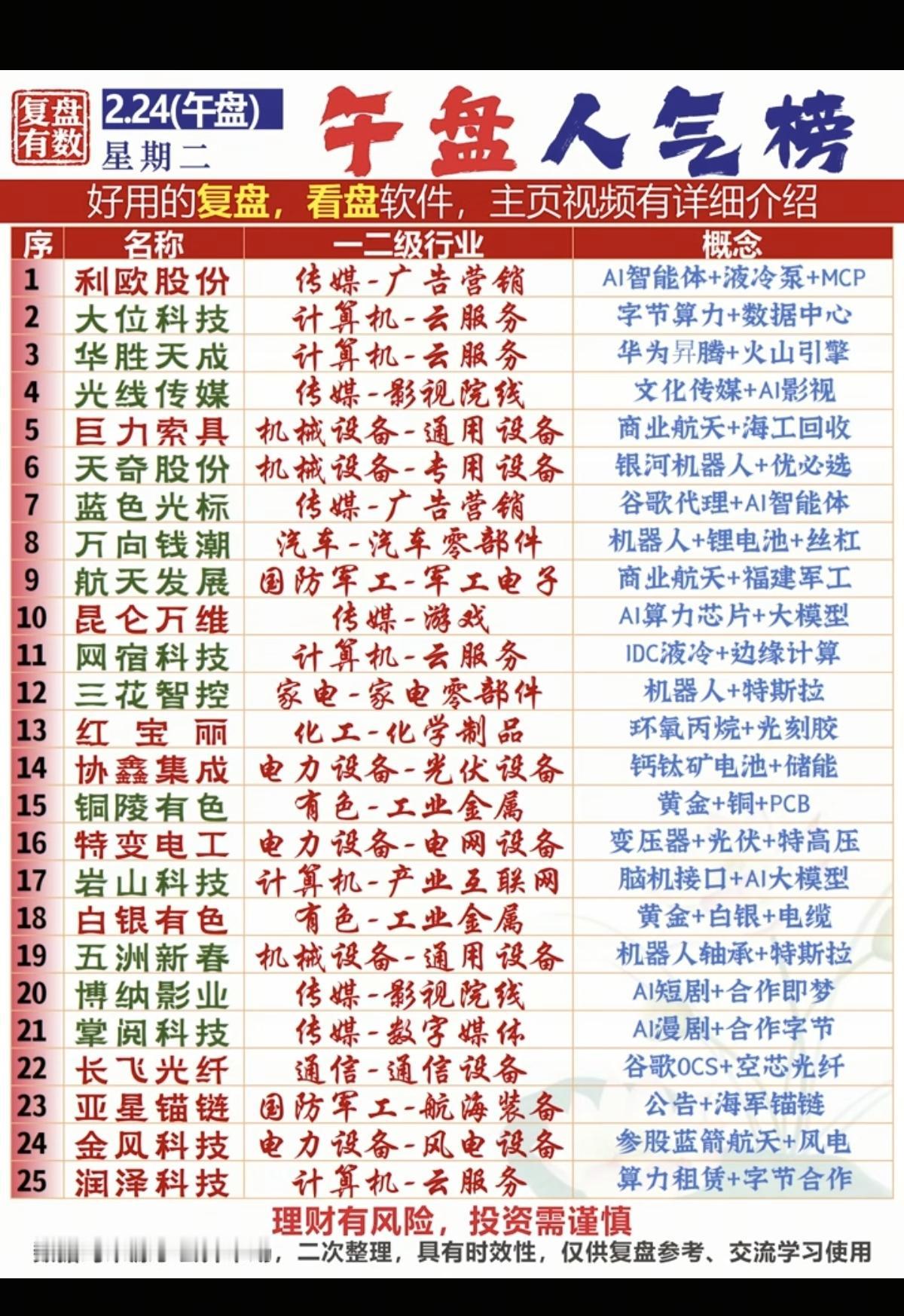 2.24周二 成交活跃个股 人气榜! 1.算力+存储芯片 2.铜金属,贵金属 3.脑机接口+大模型 4.环氧丙烷+光刻胶 5.特高压+光伏