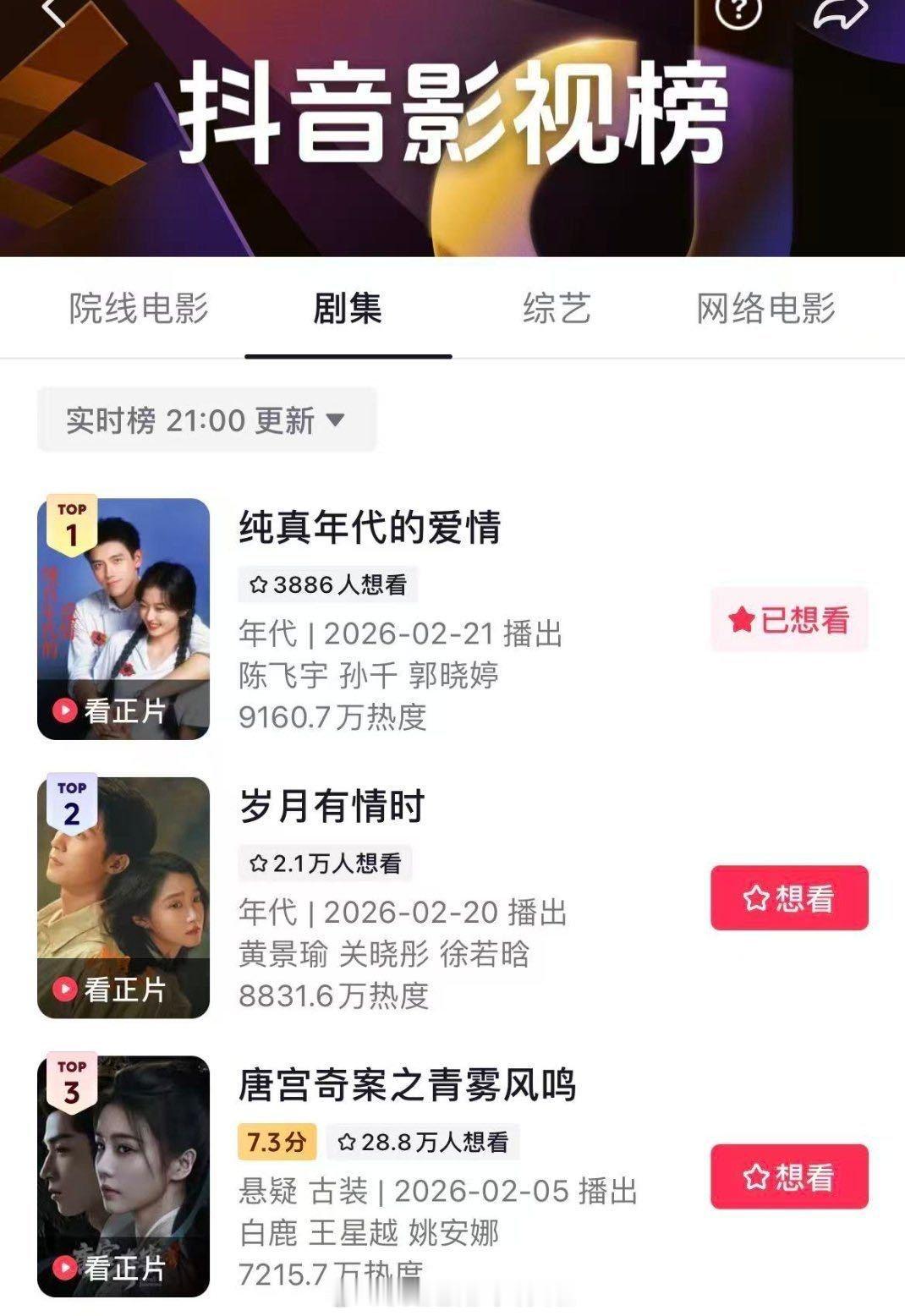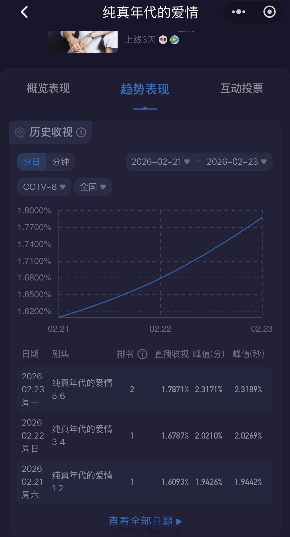 新剧看三天,《纯真年代的爱情》台网三连涨,酷云连续两天收视破2,cvb目前集均1.535,开局系数超0.9,走势不错,说明不断有观众进场,陈飞宇首个00生扛剧上央八黄金档这波实绩有啦!