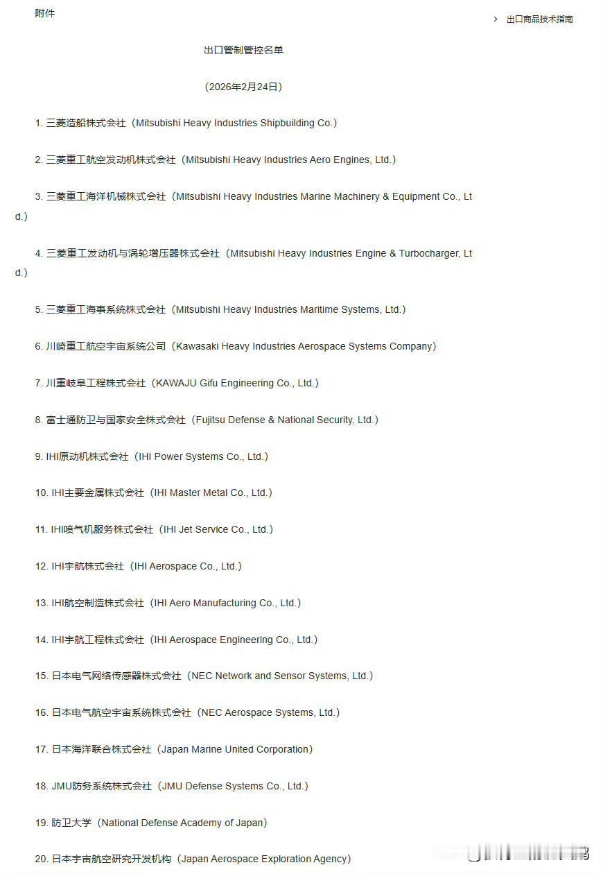 重磅新闻!【今天大年初八,开工第一天先胖揍小八嘎】2月24日电,商务部公告,根据《中华人民共和国出口管制法》和《中华人民共和国两用物项出口管制条例》等法律法规有关规定,为维护国家安全和利益,履行防扩散等国际义务,决定将三菱造船株式会社等参与提升日本军事实力的20家日本实体列入出口管制管控名单(见附件),并采取以下措施: 一、禁止出口经营者向上述20家实体出口两用物项,禁止境外组织和个人将原产于中华人民共和国的两用物项转移或提供给上述20家实体;正在开展的相关活动应当立即停止。 二、特殊情况下确需出口的,出口经营者应当向商务部提出申请。本公告自公布之日起正式实施。 附件 〉出口商品技术指南 出口管制管控名单 (2026年2月24日) 1. 三菱造船株式会社(Mitsubishi Heavy Industries Shipbuilding Co.) 2. 三菱重工航空发动机株式会社(Mitsubishi Heavy Industries Aero Engines,Ltd.) 3. 三菱重工海洋机械株式会社(Mitsubishi HeavyIndustries Marine Machinery & Equipment Co., Lt d.) 4. 三菱重工发动机与涡轮增压器株式会社(Mitsubishi Heavy Industries Engine & Turbocharger,Lt d.) 5. 三菱重工海事系统株式会社(Mitsubishi Heavy Industries Maritime Systems,Ltd.) 6. 川崎重工航空宇宙系统公司(Kawasaki Heavy Industries Aerospace Systems Company) 7. 川重岐阜工程株式会社(KAWAJU Gifu Engineering Co.,Ltd.) 8. 富士通防卫与国家安全株式会社(Fujitsu Defense & National Security,Ltd.) 9. IHI原动机株式会社(IHI Power Systems Co.,Ltd.) 10. IHI主要金属株式会社(IHI Master Metal Co.,Ltd.) 11. IHI喷气机服务株式会社(IHI Jet Service Co.,Ltd.) 12. IHI宇航株式会社(IHI Aerospace Co.,Ltd.) 13. IHI航空制造株式会社(IHI Aero Manufacturing Co.,Ltd.) 14. IHI宇航工程株式会社(IHI Aerospace Engineering Co.,Ltd.) 15. 日本电气网络传感器株式会社(NEC Network and Sensor Systems,Ltd.) 16. 日本电气航空宇宙系统株式会社(NEC Aerospace Systems,Ltd.) 17. 日本海洋联合株式会社(Japan Marine United Corporation) 18. JMU防务系统株式会社(JMU Defense Systems Co.,Ltd.) 19. 防卫大学(National Defense Academy of Japan) 20. 日本宇宙航空研究开发机构(Japan Aerospace Exploration Agency)