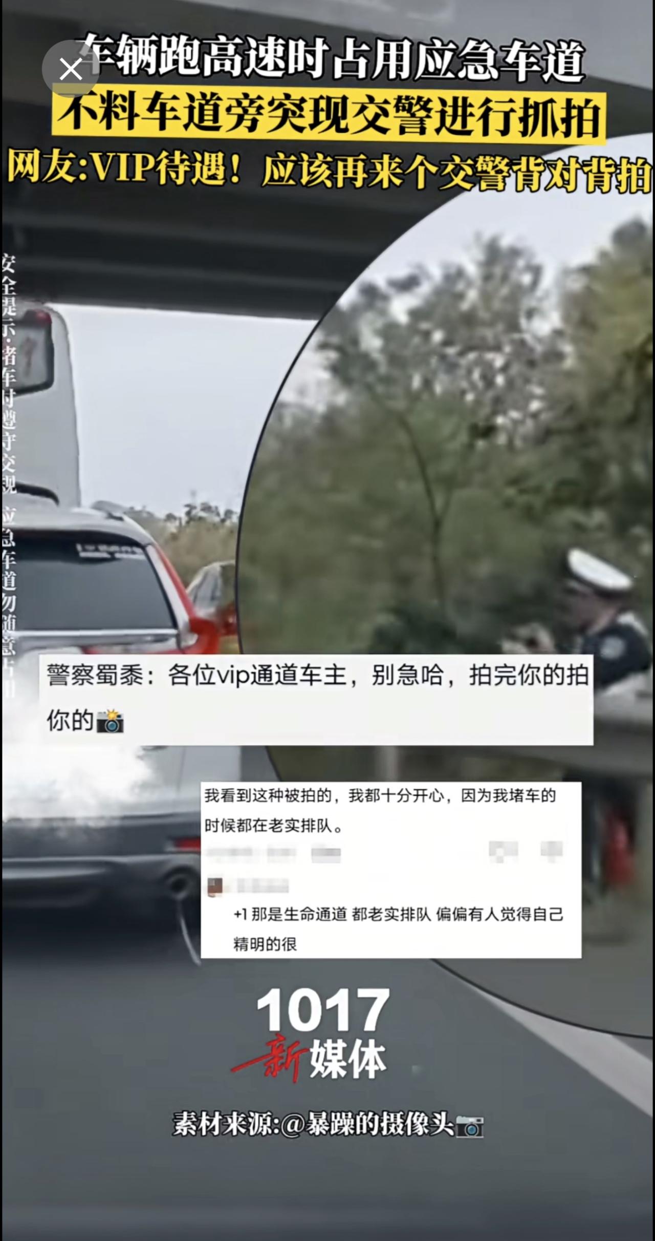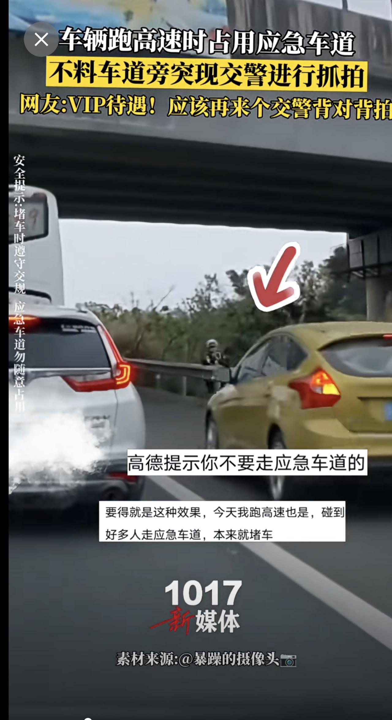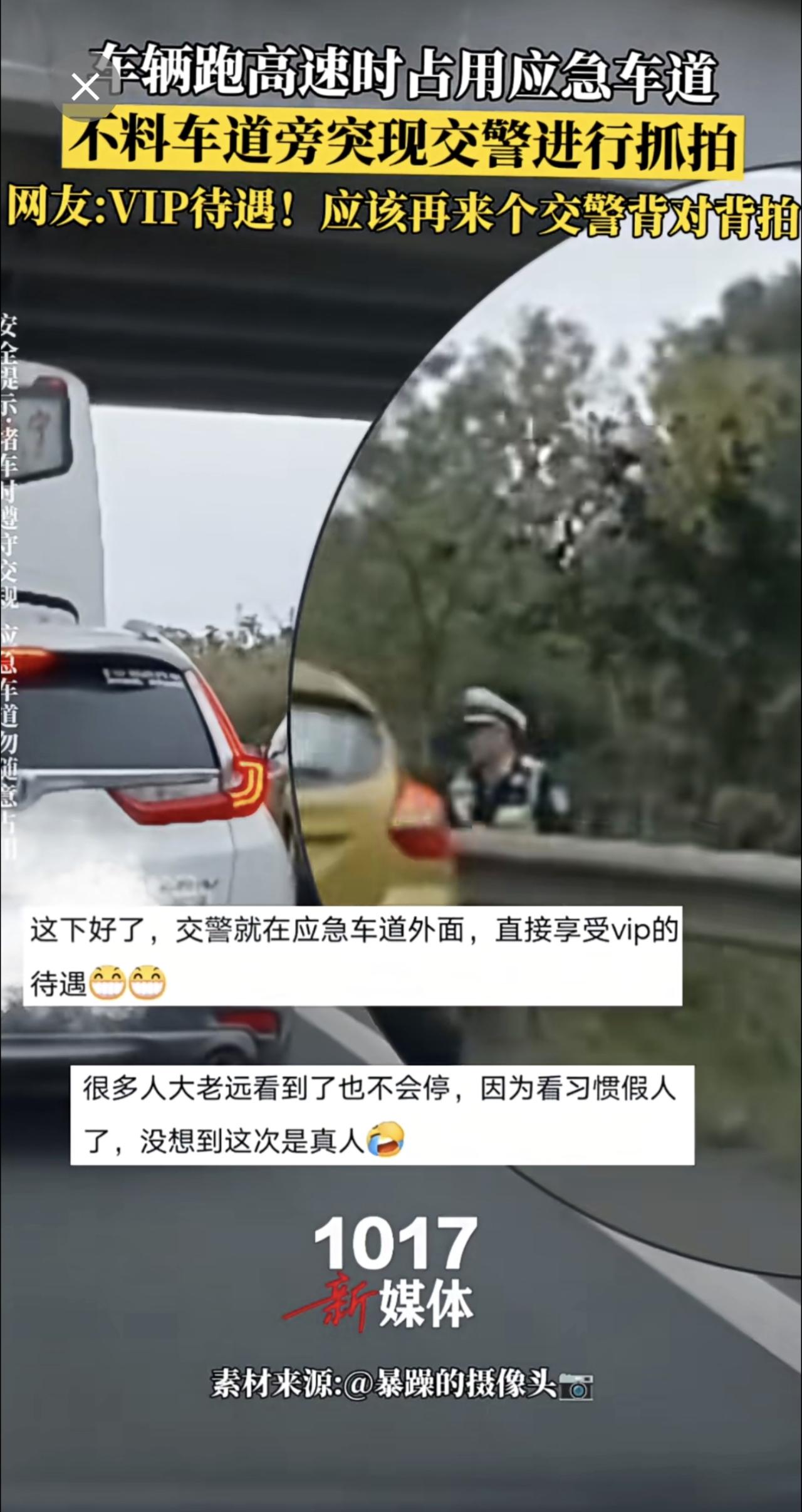 车辆跑高速时占用应急车道,不料车道旁突现交警进行抓拍,网友:VIP待遇!应该再来个交警背对背拍