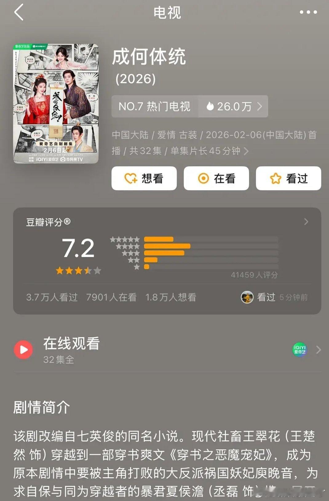王楚然、丞磊《成何体统》豆瓣评分7.2,这倒是还不错,评分人数4w+少了点
