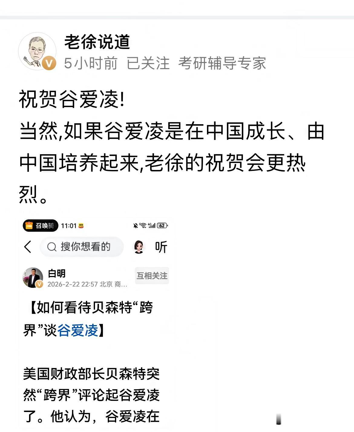 谷爱凌在意大利米兰冬奥会上一举取得了一金两银的骄人战绩。 除了一些美国人还有一些二狗子、殖子不高兴外,国内居然也有些人对谷爱凌在冬奥会上为中国队争金夺银不断的提出各种质疑。 这其中就有著名大V@老徐说道 发表头条说: “祝贺谷爱凌! 当然,如果谷爱凌是在中国成长、由中国培养起来,老徐的祝贺会更加热烈。” 看看这是什么心态!谷爱凌出生在美国,在美国的环境及体系下逐步培养、成长起来难道是罪过吗?非要这样分出个三六九等、厚此薄彼吗? 照这样的逻辑,我们很多伟大的科学家及无数科技工作者,都是在每西方发达国家的教育环境和体系下培养出来的,比如导弹之父,他们为新中国的建设和发展所做出的贡献,所取得的成就,难道我们也要区别对待吗? 殊途同归。所谓英雄不问出处,只要谷爱凌心系祖国,心向祖国,关键时刻为祖国赢得巨大荣誉,我们就应该不分彼此,一视同仁送上最真诚的祝贺!