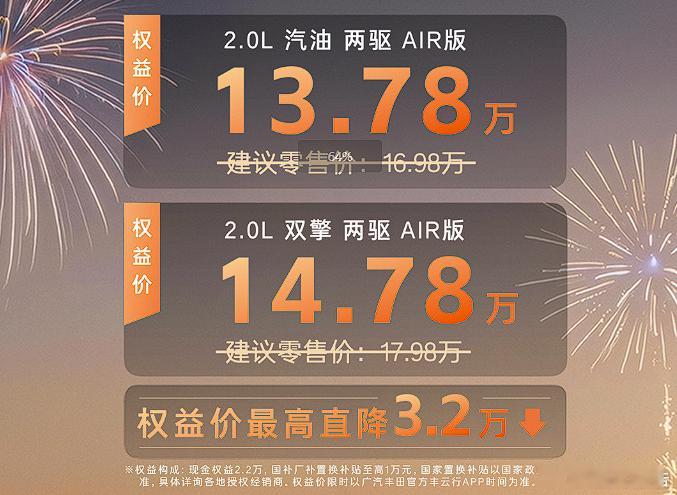 2月24日,全新广汽丰田威兰达AIR版上市,下订可享现金优惠2.2万元,再加上国补、厂补1万元,直降3.2万元,最终权益价13.78-14.78万元。
