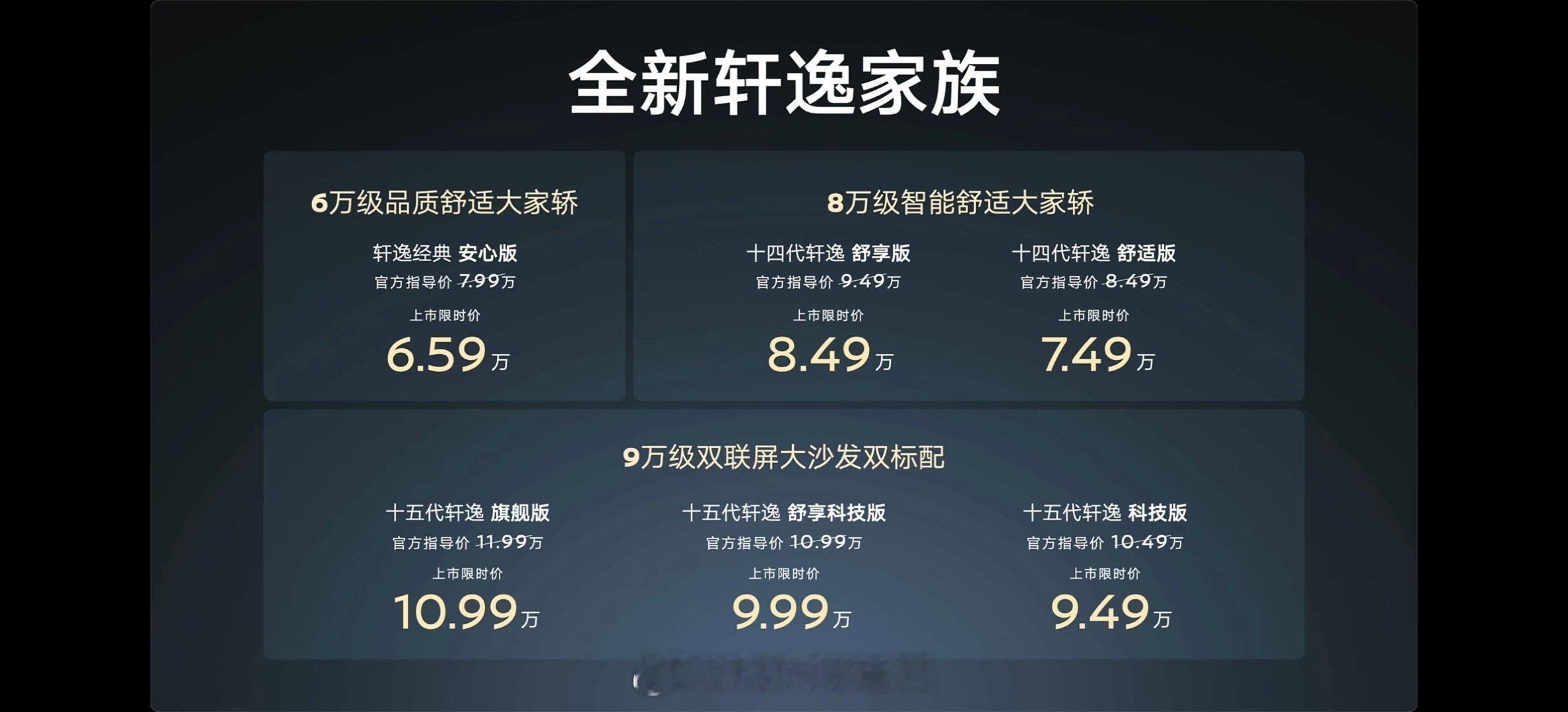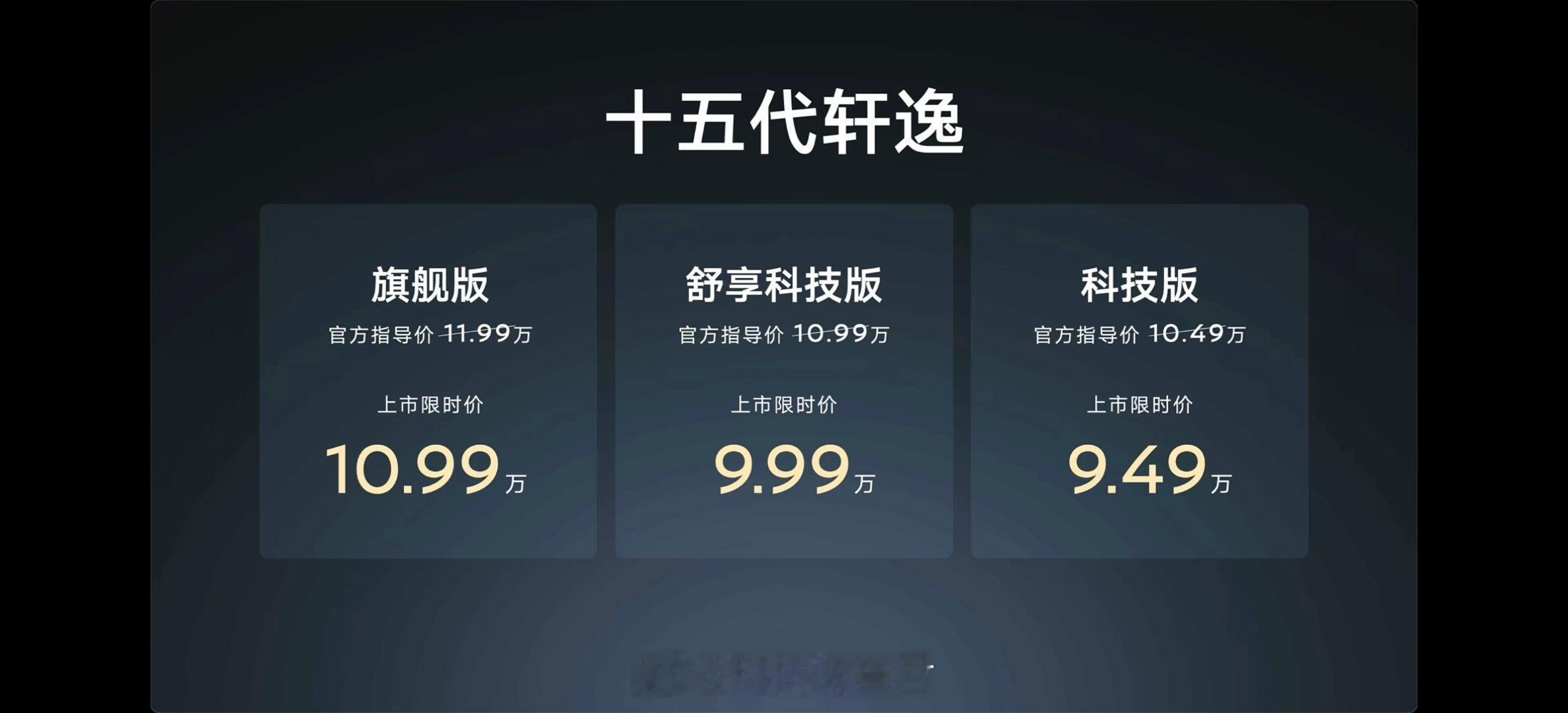 十五代轩逸科技版9.49万元舒享科技版9.99万元旗舰版10.99万元这价格太有诚意了,全标配的超算力高通骁龙8155芯片,L2级别的智能辅助驾驶,双12.3英寸一体式联屏,人体工学座椅,这个价格这个配置,朋友们觉得怎么样?轩逸东风日产