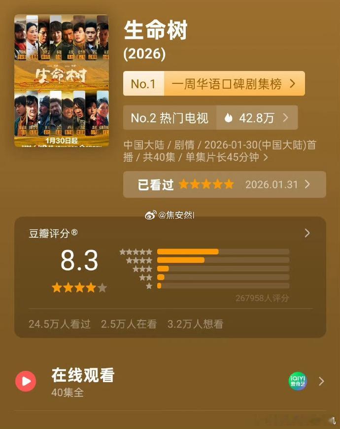 高口碑爆剧生命树的含金量生命树口碑热度双丰收生命树口碑热度双丰收,高口碑爆剧生命树的含金量,谁懂杨紫主演的生命树10天评分从8.1涨到8.3了呀,谁看了不说呀一句很牛啊,杨紫值得生命树值得~