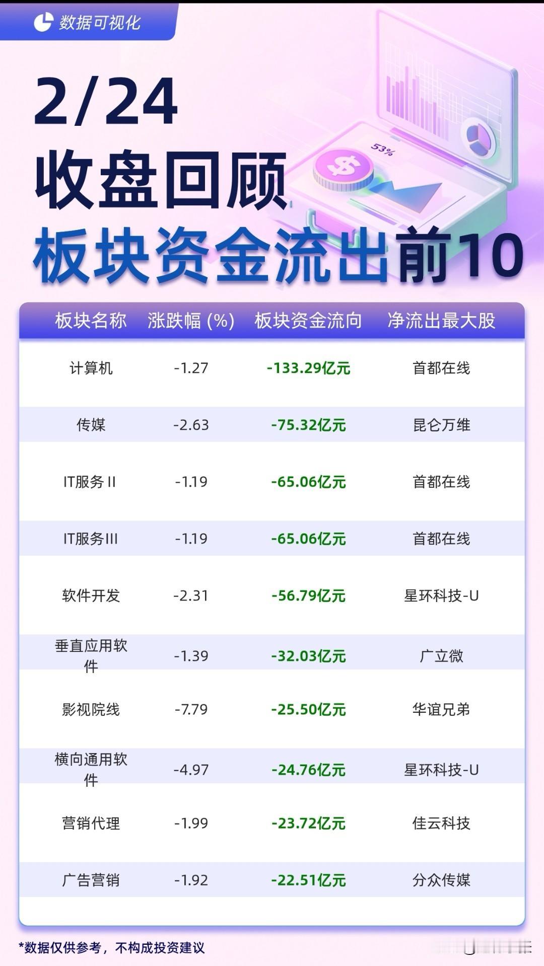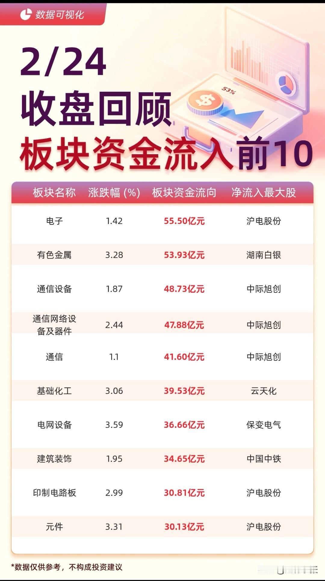 马年开门红! 2月24日A股收盘,主力资金动向分化明显。 中际旭创以21.40亿元净流入领跑个股,华工科技、中国中铁等也获主力大举加仓。 板块层面,电子、有色金属、通信设备等赛道吸金超40亿元,而计算机、传媒板块则遭遇超百亿元资金流出,首都在线、昆仑万维成为净流出主力。资金在科技与周期赛道间腾挪,市场结构性行情特征凸显。