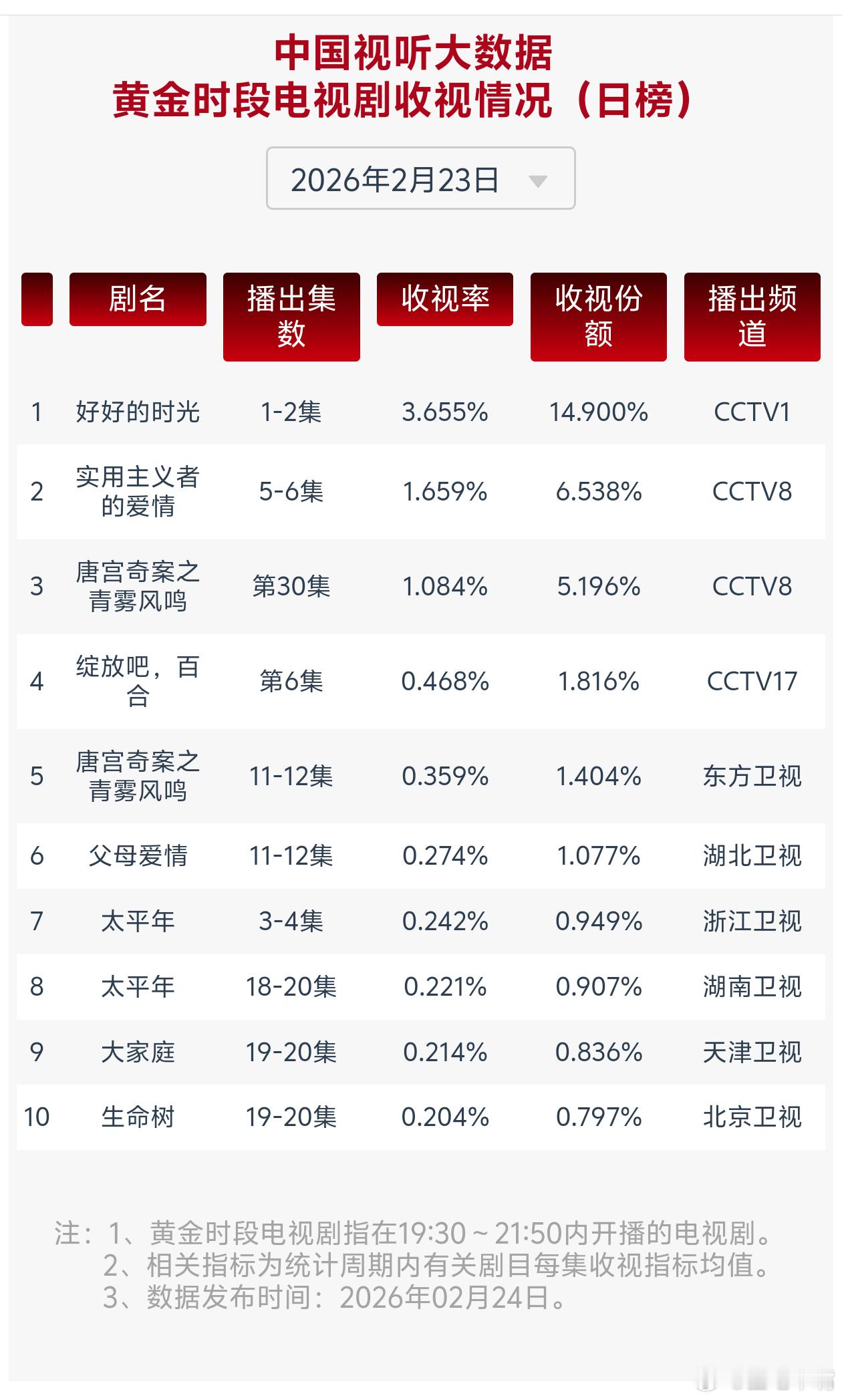半个内娱都在安利好好的时光好好的时光 2月23日cvb收视日报!《好好的时光》首播3.655,已预定2026年年冠