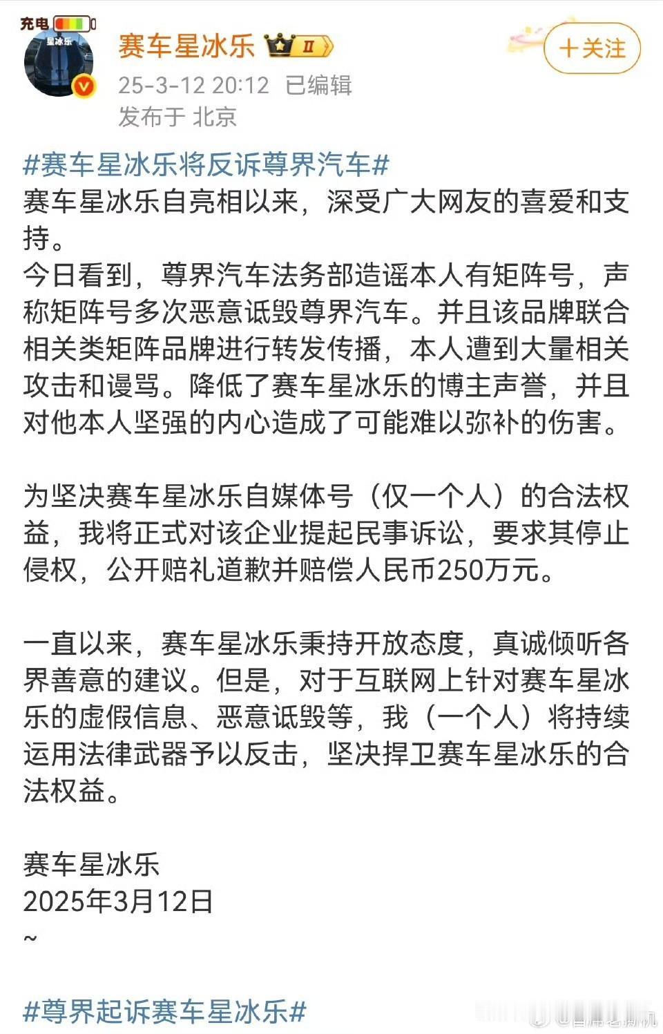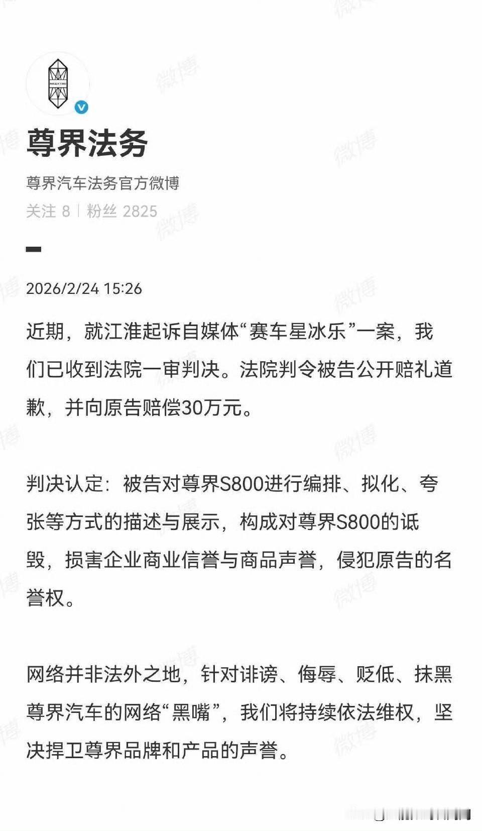 大快人心,江淮起诉自媒体“赛车星冰乐”一案,目前一审判决结果已出,法院判令被告公开赔礼道歉,并向原告赔偿30万元。不得不说,大年初八果然是好日子哈,开工即公布案件结果,30万对于“赛车星冰乐”来说还是少了些,但也算是警告吧。这不年前那会,赛车星冰乐还在网上发牢骚要账讨薪呢,现在想想怪不得着急呢![捂脸] 话说这人之前嘴硬要求华为方面赔偿250万呢,看看他怎么应对吧。
