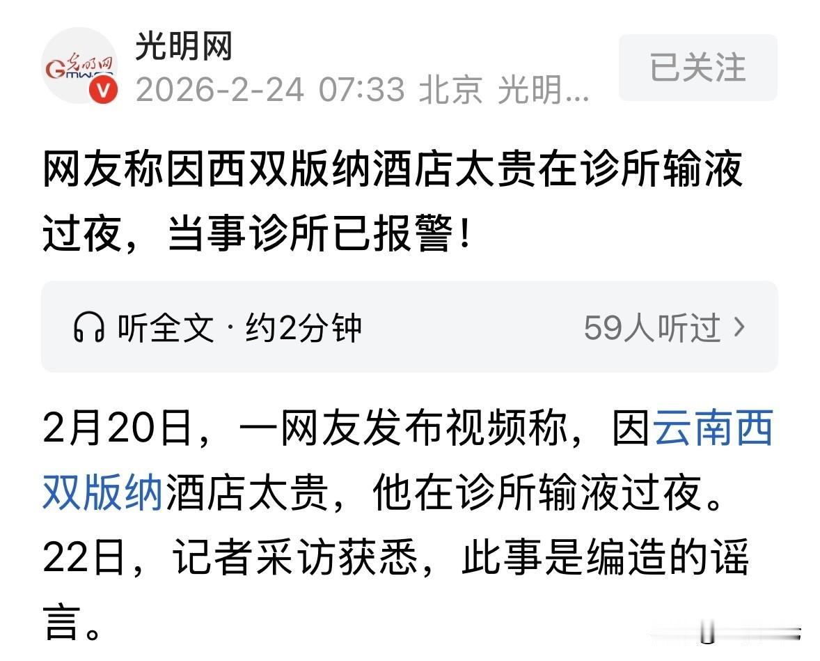云南西双版纳,男子嫌酒店价格太贵,不舍得住,他脑瓜一转,来到一家诊所打了2个吊瓶,边打边躺床上舒舒服服睡了一觉,美美省了一笔酒店钱。为了彰显自己很聪明,他还把经历发在网上,让大家效仿他。没想到,视频火了,诊所看到后头大了,他们直接报警,背后真相出乎所有人的意料。 2月20号这天,网上一段视频火了。 发视频的是个男的,操着一口外地口音,说自己到了云南西双版纳,结果被这边的酒店价格吓傻了眼。 他直呼“太贵了,真住不起!” 因为没钱住店,前一天晚上喉咙又不舒服,他干脆想出一招,既能看病,又能省去住宿费,那就是去路边小诊所挂吊瓶,顺便蹭住一宿。 男子说自己在诊所凑合了一宿,睡到天亮才醒。他还特意晒了一张给诊所转账的截图,以及自己躺在病床上的照片。 他洋洋得意配文道:困难是有的!要想办法克服困难,出门不舍得开高价房的,跟我学一下。 这视频一出,大家都直呼:高,太高了! 短短两天,这视频就攒了快10万个赞,被转发了20多万次。 评论区里全是心疼他的,还有人夸他机智。 然而,真相是真是这样吗? 2月22号,有记者觉得这事儿有点邪乎,顺着网线摸了过去。先联系了发视频的这名男子。 这回他换了个说法,支支吾吾地说:19号晚上确实去打针了,当时睡着了,医生护士没忍心喊我,一觉睡到20号早上9点。 听着好像挺合理,但记者转头就联系了那家诊所。 电话一接通,诊所的工作人员一听这事儿,说这纯属胡说八道!简直是造谣! 工作人员声音都高了八度,说:我们是看病的地方,又不是旅馆!怎么可能让病人打着吊瓶在这儿过夜?这视频上说打了两瓶吊针,让人以为我们医生护士都不负责一样,没人管病人! 诊所这边越说越气,直接放了狠话,说这对我们名声影响太坏了,已经报警了! 记者又赶紧联系了当地派出所。民警表示接到报警了,我们已经去诊所查过了,监控都看了,这视频就是纯炒作,瞎编的。 纸终究包不住火。记者再次拨通了那个视频博主的电话。这回,在铁证面前,这哥们儿终于不装了,老老实实交了底。 原来,真相特别打脸。他根本没在诊所过夜!真实情况是,视频发布当天,也就是20号早上,他才去的诊所看病。 至于为什么要编这么个离谱的故事?他在电话里吞吞吐吐,最后憋出一句大实话:就是为了搞点流量……其实流量对我也没啥大用,也就涨了几个粉丝。 为了几个粉丝,为了那点虚无缥缈的流量,他不仅把自己变成了跳梁小丑,还把一家正经诊所拖下了水,让人家背了不负责任的黑锅。 这名男子刚开始,可能确实觉得西双版纳房价贵,心里有点怨气。但当他拿起手机拍视频的那一刻,这种怨气就变味了。 他脑子里想的不再是怎么解决住宿问题,而是怎么拍才能火? “在诊所过夜”这个点子,对他来说简直是天才般的创意。既能卖惨博同情,又能制造话题,还能显得自己“聪明”。 在按下发送键的那一瞬间,看着不断上涨的点赞数,他心里大概是窃喜的,觉得自己掌握了流量密码。 但他忘了,互联网也是有边界的。为了圆一个谎,他不得不撒更多的谎,直到最后被拆穿,不得不面对全网的嘲笑和可能的法律责任。 现在再看那段视频,那个一脸委屈说要想办法克服困难的男人,显得格外讽刺。 他确实“克服”了困难,只不过是用撒谎的方式,克服了自己不想花钱的困难,最后却给社会和别人制造了更大的麻烦。 流量这碗饭,不是这么吃的。你可以分享真实的穷游经历,哪怕再苦再累,大家也会敬你是条汉子。但你不能把苦难当剧本,把公众当傻子。 《治安管理处罚法》第25条第1项规定:有下列行为之一的,处五日以上十日以下拘留,可以并处五百元以下罚款;情节较轻的,处五日以下拘留或者五百元以下罚款:散布谣言或者以其他方法故意扰乱公共秩序的。 网友为博流量编造“因房价贵在诊所过夜”的虚假信息,符合“散布谣言故意扰乱公共秩序”的构成要件。 主观上,男子明知内容不实,却为涨粉刻意捏造“没钱住店”的悲惨情节。 客观上,视频获近10万点赞、20万转发,引发公众对医疗安全的误解,让人以为诊所无人值守,并导致警方出动调查,已造成公共秩序的实际扰动。 虽然男子辩称“流量没用”,但动机不影响违法定性。网络空间并非法外之地,该行为已超出言论自由边界,触碰法律红线。 派出所认定其为“炒作”并介入,正是依据此条对虚假信息传播进行规制。 如果,谣言造成更严重后果如诊所营业损失,男子还需承担民事赔偿甚至刑事责任。 对于这件事,你怎么看? 欢迎关注@一案一论