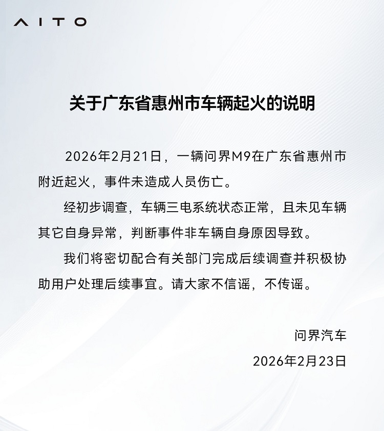 问界M9起火声明针对2月21日发生在惠州的一起问界M9起火事件,问界官方发布声明,“经初步调查,车辆三电系统状态正常,且未见车辆其它自身异常,判断事件非车辆自身原因导致。 ”