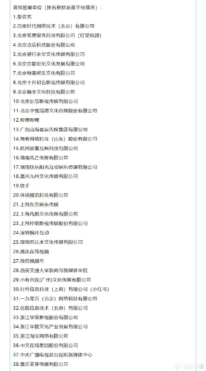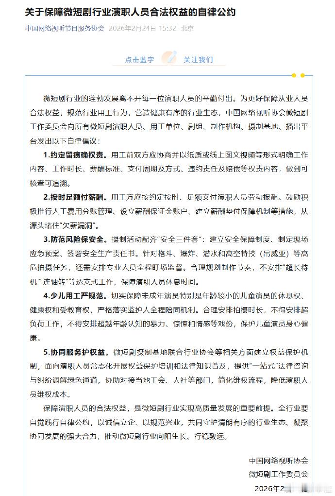 38家单位签署微短剧自律公约 微短剧行业的蓬勃发展离不开每一位演职人员的辛勤付出。为更好保障从业人员合法权益,规范行业用工行为,营造健康有序的行业生态,中国网络视听协会微短剧工作委员会向所有微短剧演职人员、用工单位、剧组、制作机构、摄制基地、播出平台发出以下自律倡议:保障微短剧从业人员合法权益规范微短剧行业用工行为