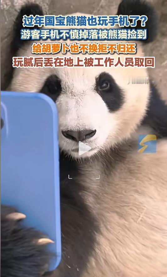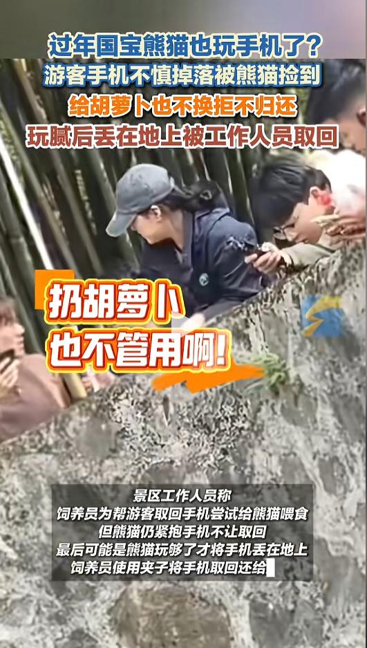 “原来不只人喜欢玩手机啊!”近日,四川都江堰,一游客在中华大熊猫苑景区游玩时,不慎将手机掉落,被园区的大熊猫抓在手里。随后景区饲养员试图将手机用夹子夹上来,可没想到大熊猫死死的将手机抓在手中。网友:网瘾大熊猫出现了! 据媒体2月23日报道,事发当日,该游客在景区游玩时,一时不慎,将手机掉了下去,被下方的大熊猫抓在手里。女子联系了饲养员,希望饲养员能帮她把手机取回来。 饲养员见状,拿来了长夹子,试图用夹子将手机夹上来,没想到大熊猫的爪子死死的抓住手机,就是不给,饲养员根本夹不动。 随后,饲养员又给熊猫投喂胡萝卜,试图转移它的注意力。可谁知大熊猫根本不上当,只见它一手抓着手机,一手拿起扔过来的胡萝卜就啃了起来。胡萝卜都吃完了,也没把手机松开。 这下子饲养员也没了办法,只能在上面等着,看看有没有别的机会。过了一会儿,大熊猫似乎是玩腻了,抓的没那么紧了,不久就把手机随手扔在了一边。 饲养员眼疾手快,一下子把手机夹了上来,游客这才拿到了心心念念的手机。这一幕也逗翻了一众游客,直呼没白来! 网友看后表示:国宝大熊猫玩过的手机,这回去可有的吹了。没想到大熊猫外表萌萌的,它也知道手机是好东西啊。还有网友给做了脑补,“大熊猫:急了吧,哎,我就不给!” 信息来源:《过年国宝熊猫也玩手机了?游客手机不慎掉落被熊猫捡到,给胡萝卜也不换拒不归还。玩腻后丢在地上被工作人员取回。