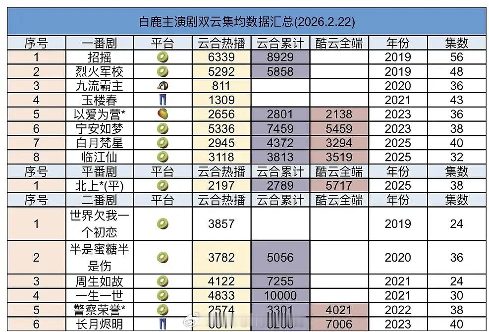 白鹿出道以来所有主演剧集云合汇总这成绩已经非常牛了