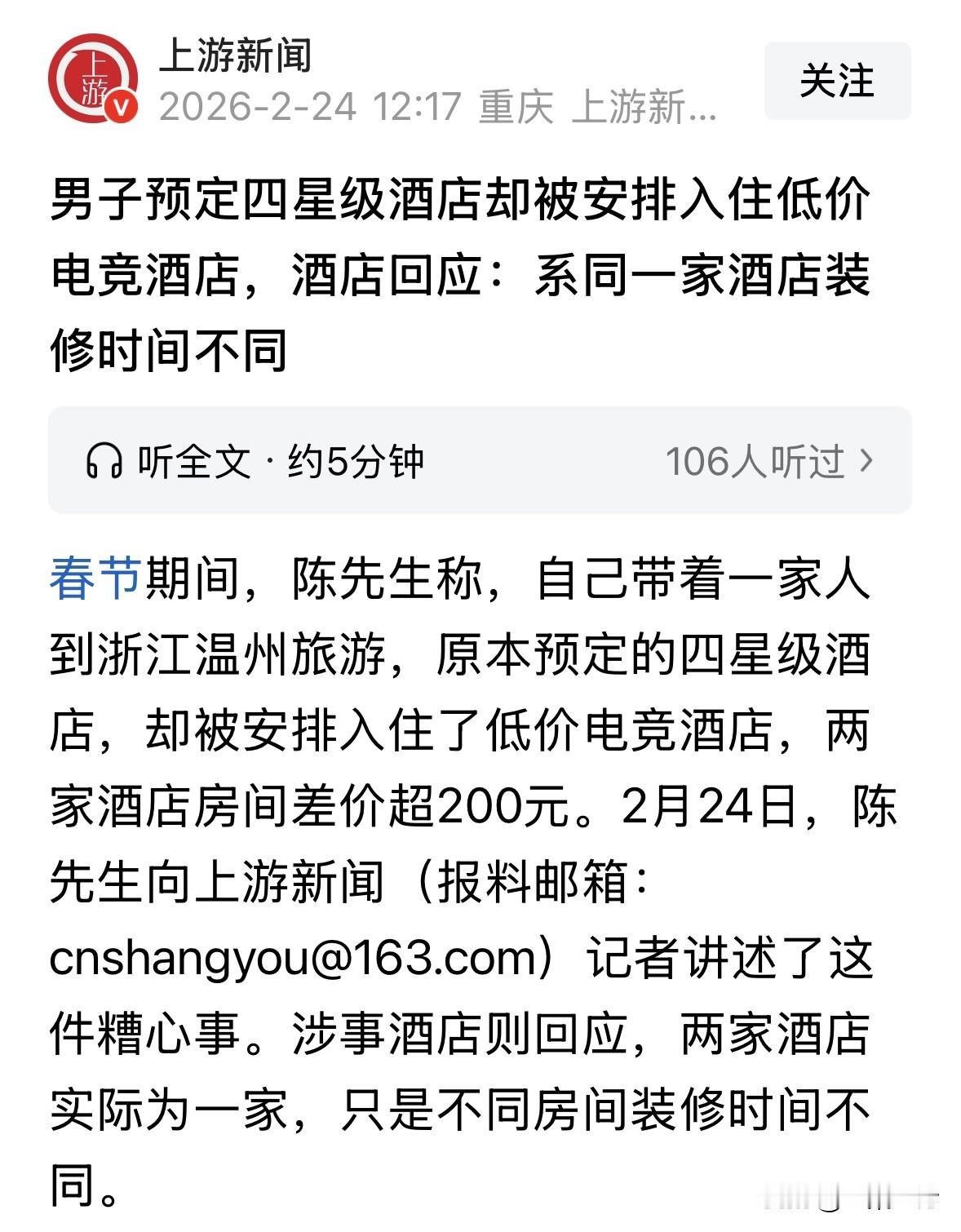 “好一个挂羊头卖狗肉!”浙江温州,一男子春节带家人旅游,他花1174元订了3间4星级酒店房间,可入住后发现,他竟被安排入住186一晚的低价电竞酒店,而他花的是390一晚的钱,差了200元,男子怒了,这不是偷梁换柱吗?可酒店却一口咬定:2个酒店是同一家,一个老板,只是装修时间不同。 陈先生趁着春节放假,带着一家人开开心心地去旅游,为了这几天,他已经做了好久的攻略了,可以说准备充足。 可谁能想到,这趟旅行却因为酒店的事儿,闹得挺糟心。 陈先生担心春节出行的人太多,期间酒店不好订,就提前在平台,花11174元,订了3间星级酒店。 陈先生虽然不差钱,但也不是个花钱大手大脚的人,但穷家富路,再加上一起出来玩的还有老人,他就不想在住上面节省,让老人休息好,才能玩的开心。 他在预定的时候,特意看了评价,在他看来,只要评价好,一般都差不了。 而且,平台也明确标注这是四星级酒店,他要的就是四星级的服务水平。 预订成功后,他手机收到了这家酒店的短信,这让陈先生心里还挺踏实。 到了酒店,陈先生临时做了调整,本来他跟亲属一个房间,但他怕自己晚上打呼噜,影响对方休息,决定还是给自己重新开一个房间。 这次,陈先生可能为了省钱,毕竟自己一个人,没必要住那么贵的房间,他就在同一幢大厦的电竞酒店要了一个房间,才186元一晚,比他给亲人定的390一晚的,要便宜200元呢。 可万万没想到,陈先生一住进去傻眼了,他的房间竟然在390一晚酒店隔壁。 这说明,他花的是390元一晚的四星级酒店的钱,实际上把他们安排在186一晚的电竞酒店了,幸亏他开了一间房,否则还发现不了。 陈先生气坏了,这不是坑人吗?他决定去找酒店问个明白。 可酒店前台工作人员只是说,四星级酒店和电竞酒店是同一家酒店,一个老板的,就是装修时间不一样而已,但对于为啥货不对板,却没给出合理的解释。 而记者发现,两家酒店在公开的股权、股东信息里根本没什么关系,一个是四星级酒店,一个是经济型酒店。 陈先生觉得酒店这就是在欺骗消费者,而且,订酒店的平台也有责任。 后来,平台愿意补偿陈先生600元,可陈先生不认可,最终,平台做出全额退款的处理方案,预计24小时到账,这事儿才算有了个说法。 陈先生春节带家人旅游,本是开开心心的事儿,却因酒店“偷梁换柱”闹得糟心。 酒店这种行为实在不地道,消费者花四星级的钱,就该享受四星级的服务和住宿环境,可酒店却以同老板、装修时间不同为由,将消费者安排到低价电竞酒店,这明显是在欺骗消费者,损害了消费者的合法权益。 平台在这件事里也有不可推卸的责任。 作为连接消费者和酒店的桥梁,平台有义务对入驻酒店进行严格审核,确保提供的信息真实准确。 可陈先生遇到的情况说明平台在审核环节存在漏洞,没有尽到应有的责任。 好在最后平台做出了全额退款的处理,这也给其他平台和商家提了个醒,诚信经营才是长久之道。 消费者在遇到类似问题时,也要勇敢站出来,通过合法途径维护自己的权益,不能让不良商家得逞。 《消费者权益保护法》第55条规定,经营者提供商品或者服务有欺诈行为的,应当按照消费者的要求增加赔偿其受到的损失,增加赔偿的金额为消费者购买商品的价款或者接受服务的费用的三倍;增加赔偿的金额不足五百元的,为五百元。 在此案例中,酒店以低价电竞酒店冒充四星级酒店,存在欺诈行为,陈先生有权要求酒店按照上述法条进行赔偿,以维护自身合法权益。 对于这件事,你怎么看? 欢迎关注@一案一论