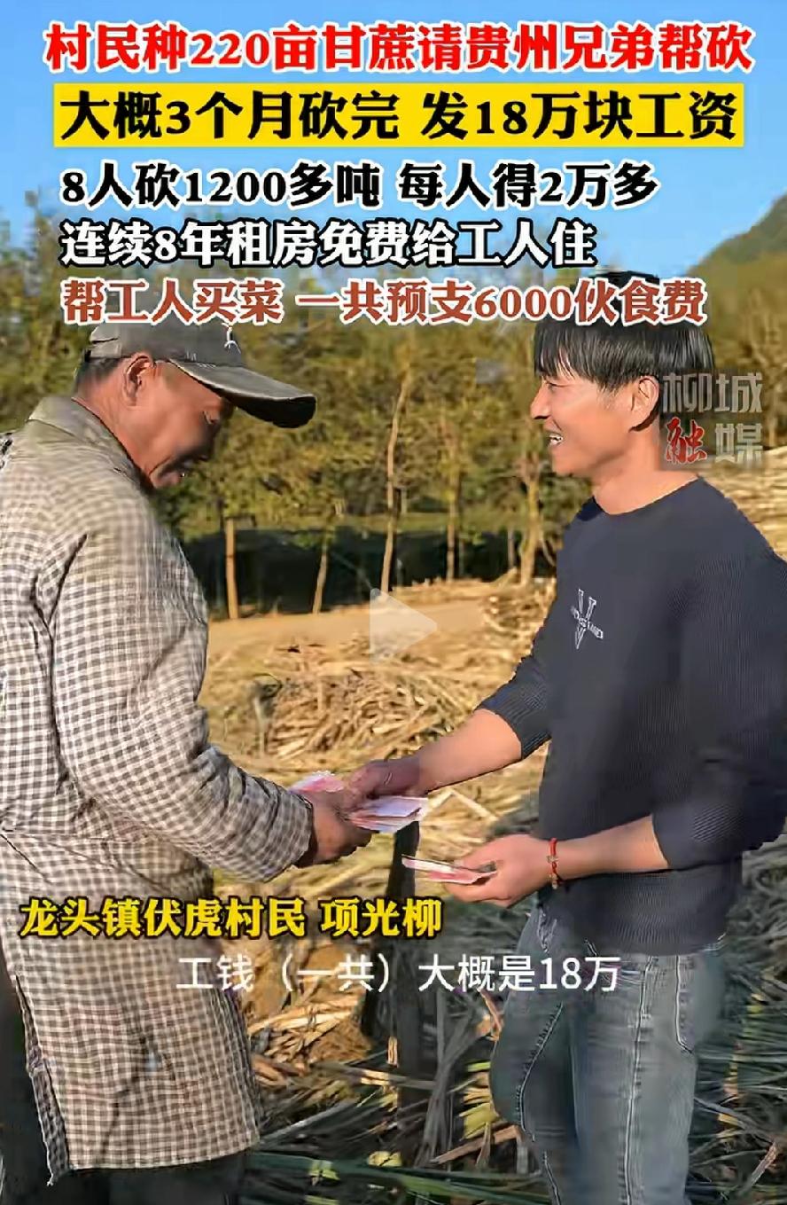 贵州8人3个月砍220亩甘蔗拿18万工资,真的不多!每人不到2万5,一个月也就7000多,一天200多,总共砍了1200吨,每人150吨,15万斤!比在工地搬砖还累!不过好处除了管吃管住,很多人在户外太阳下干活,风景好有说有笑,图个自由自在,也不错!