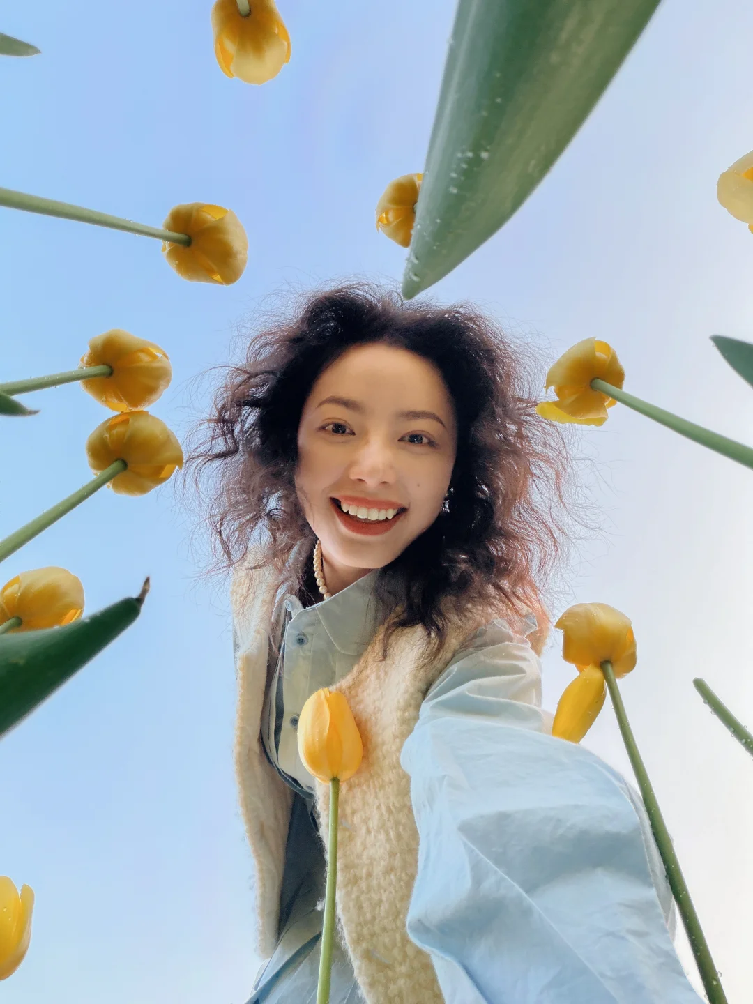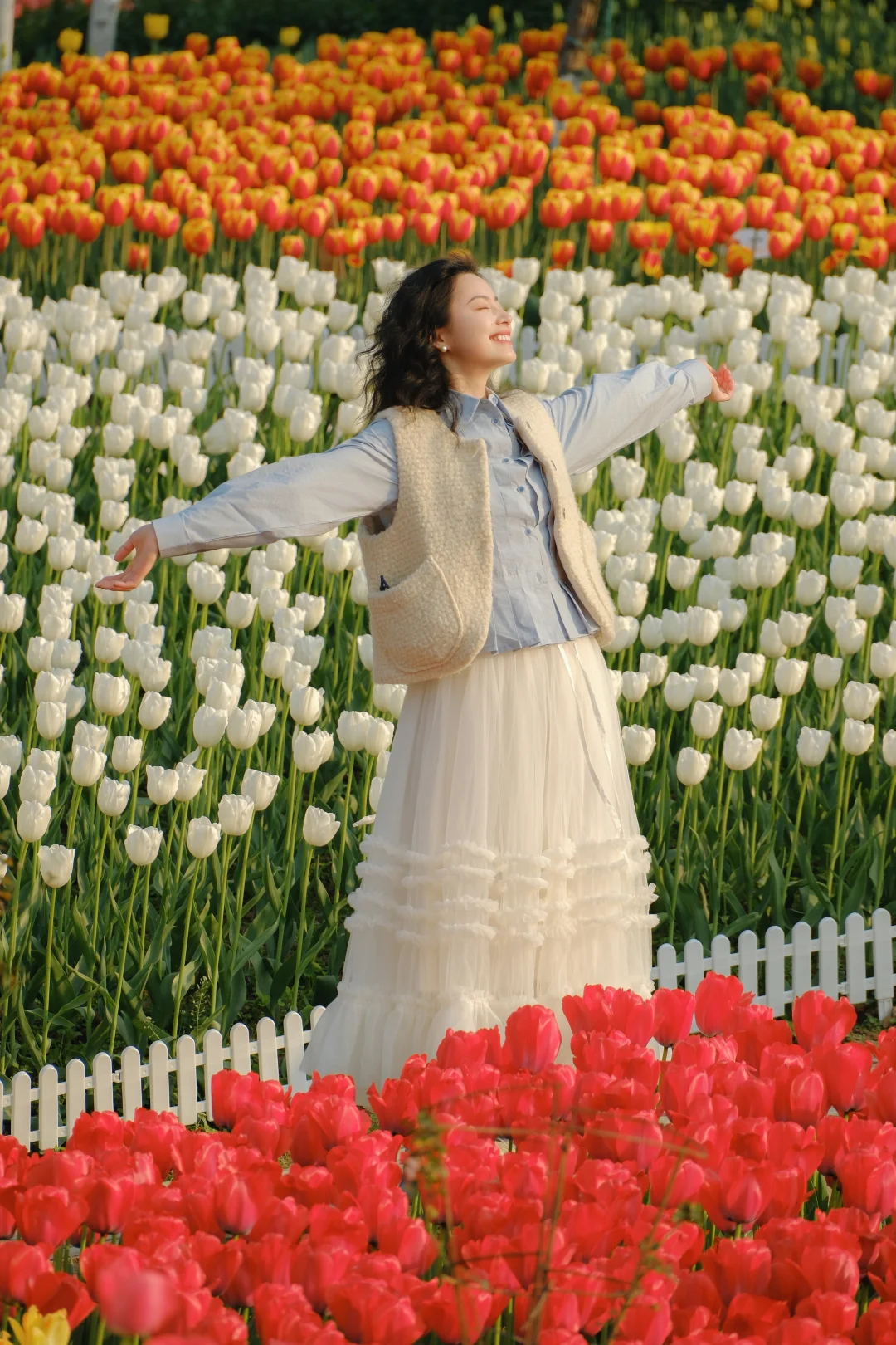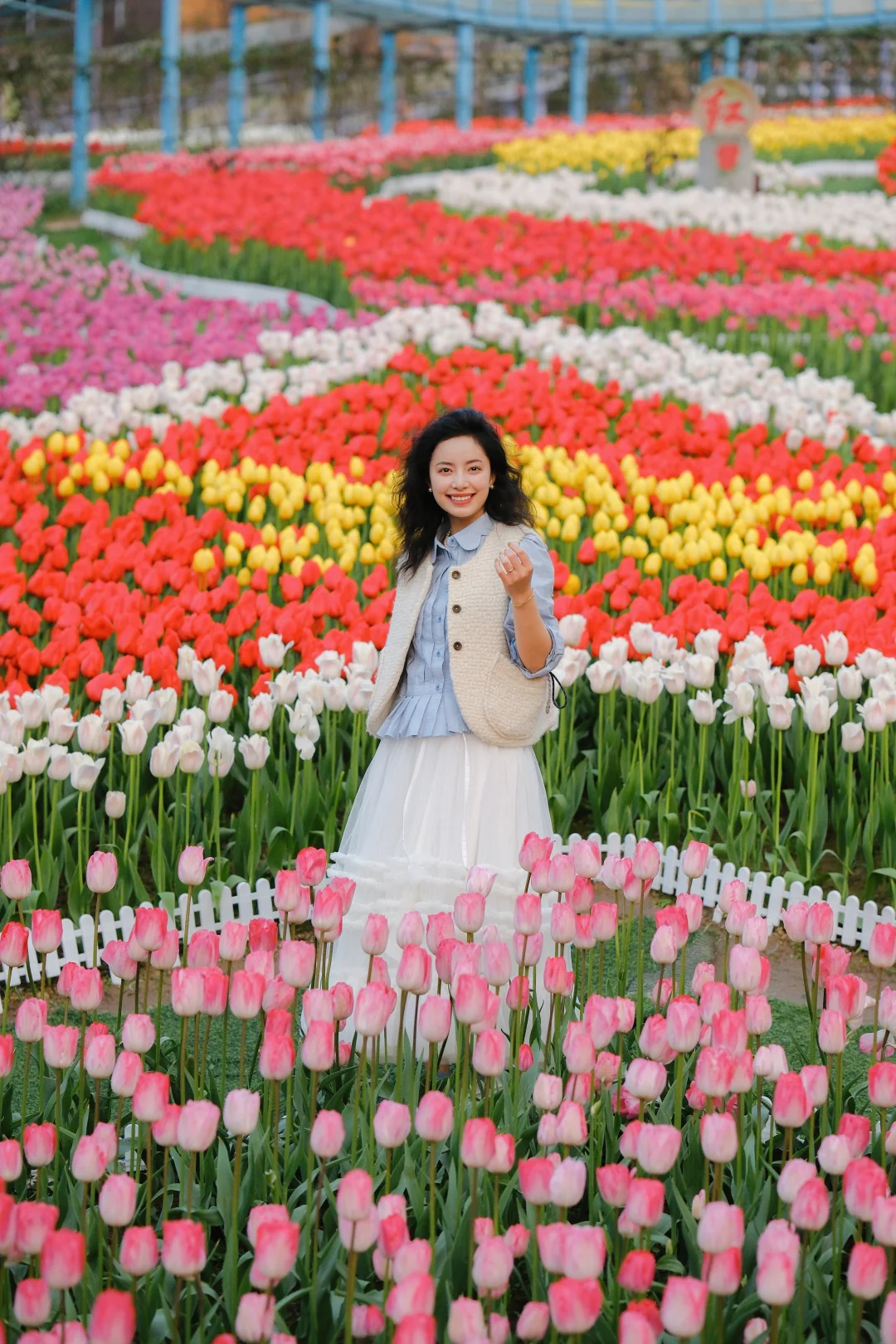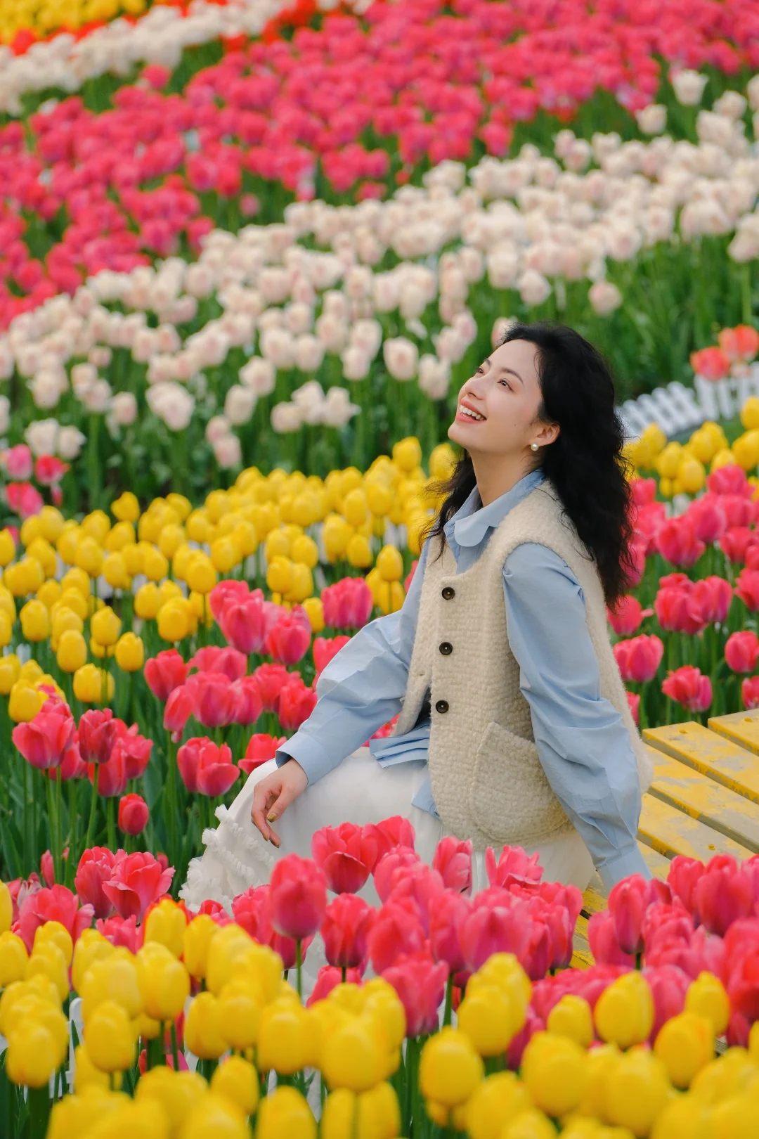 2️⃣没有长焦的朋友,这里的郁金香每一片中间都有空地,找两片坡度比较大的郁金香,人坐在两片郁金香之间,机位略高与头顶,也是可以拍到坐在郁金香花之间的照片