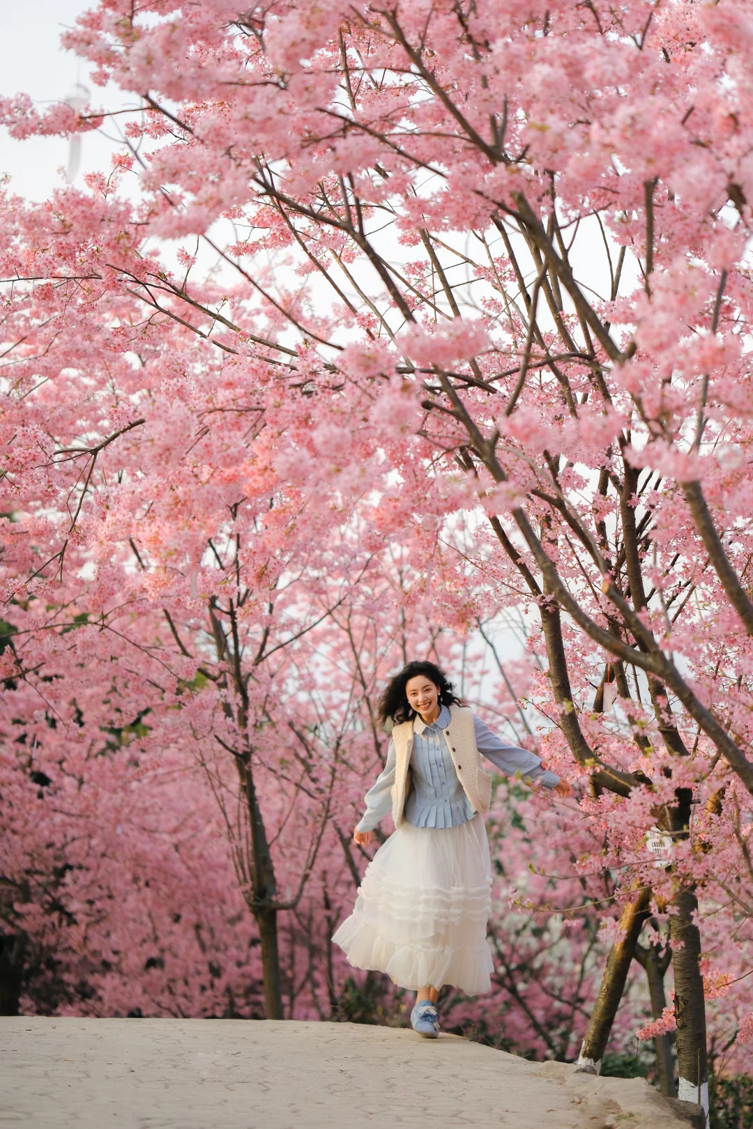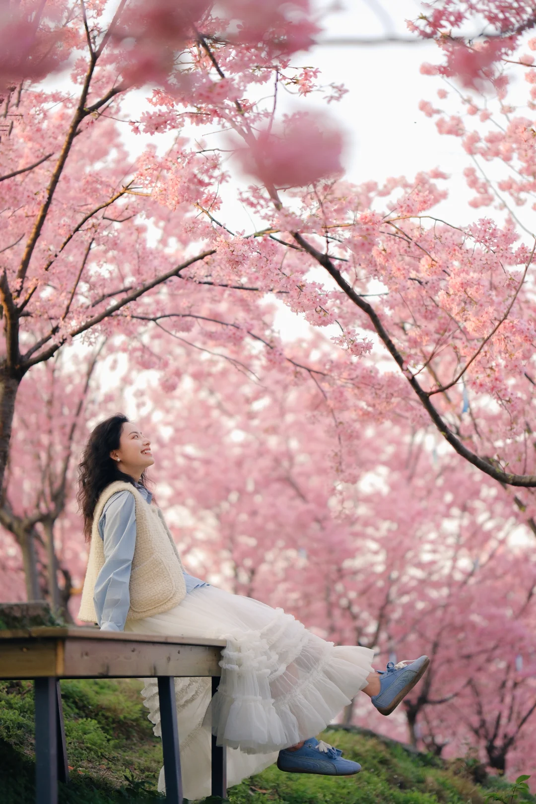 1️⃣山顶的长凳子前面的空地,这个位置地势稍高,旁边就是樱花树树冠,可以很好地拍到站在樱花树下的照片