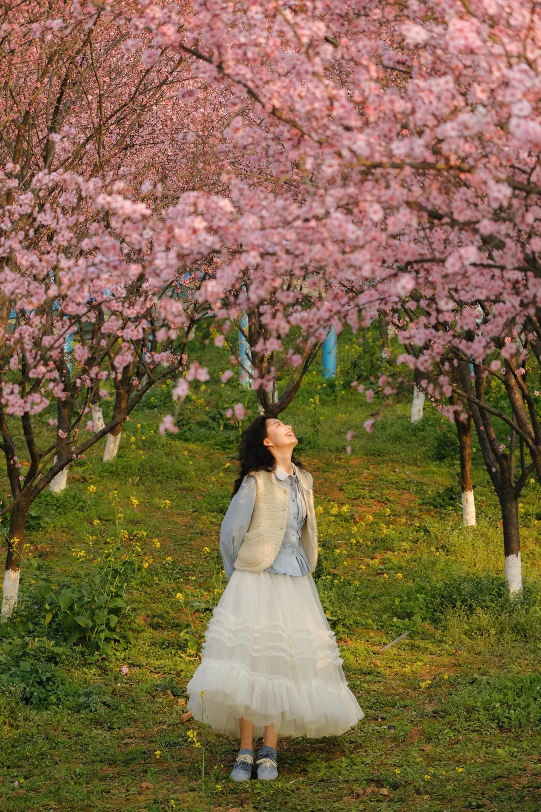 🔺坐在木板上,可以低机位拍摄,用地面的草地把木板的铁柱遮住,就能拍出置身樱花林的氛围