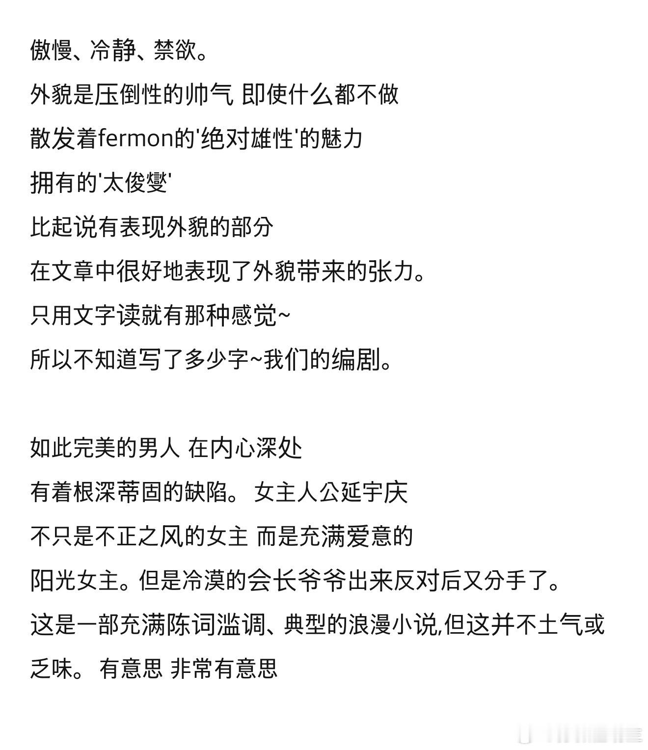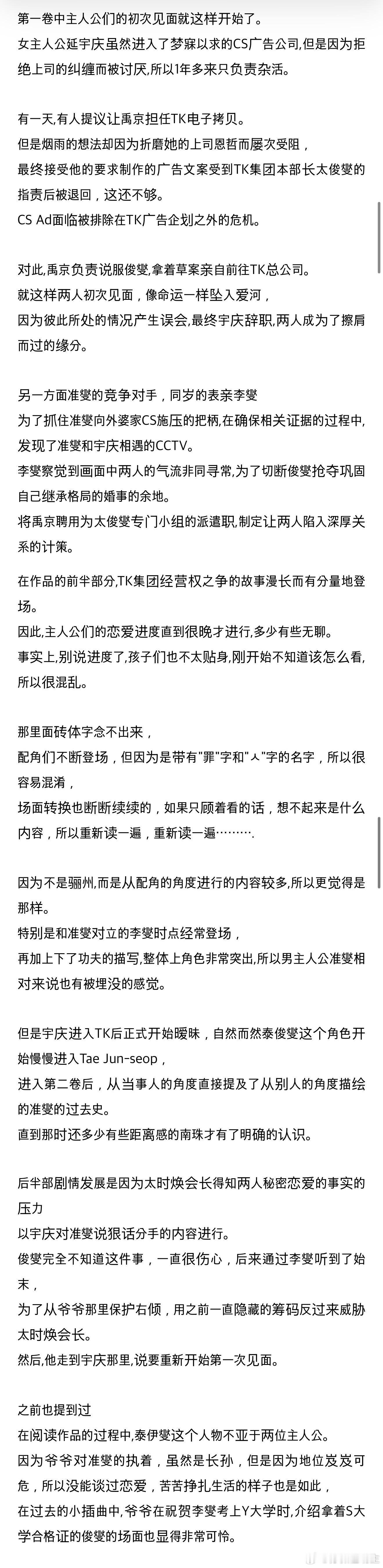 这里有几个『泰然的谎言』的总结~只翻了一个,其他几个大家看图片机翻 我自己觉得哈泰俊燮这个角色是有挑战性的,不是简单霸道总裁那种。1. 作者将大企业的运作和细微的办公室政治描绘得如同纪录片一般,令人赞叹。这虽然可能提高了阅读门槛,但前期埋下的各种伏笔在后期被逐一回收,也很有味道。2. 男主泰俊燮的过去虽然有点像反派,但仔细看的话,不得不承认。他受了很多苦,遭受了压迫,如果没有选择,这种性格就会形成。目前泰俊燮的内心世界通过大量让人好奇的台词展现得非常精彩。特别是对过往台词的运用和呼应做得极好。作者愿意回头确认、调用之前的台词,并将其巧妙地融入各处,这种对细节的用心令人赞赏。3. 节奏紧凑,不拖泥带水。虽然是典型的财阀接班人竞争结构,但并不是女主接受了胁迫并逃跑,那种拖拖拉拉、持续好几年的作品。是2周吗?在两周内男主整理了所有的事情,女主也爽快的承认了自己的感情,这很好。4. 在泰俊燮视角下的情感脉络,或那些爱恨交织的场景中,作者的文笔展现得淋漓尽致。5. 泰利燮的登场很有紧张气氛。6. 虽然没有露骨的场面,但依然足够动人。反而是在办公室里发生的那些肢体接触,更让人心跳加速、小鹿乱撞。7. 延宇京决定分手,跟随泰俊燮出差去日本的两天一夜充满了紧张感。特别是分手后延宇京寄存在日本酒店的干洗衣物,后来被送到韩国他家里的这个细节,非常棒。一个男人,每天在自己家里看到那个相爱却不得不分手的女人的衣服的心情! 男人的心碎了。真的是疯掉了。
