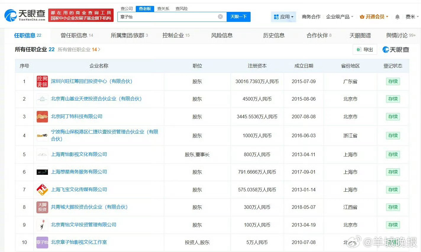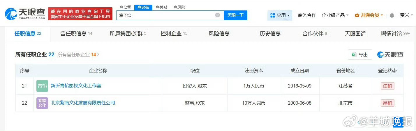 天眼查App显示,章子怡名下关联22家企业,其中10余家企业处于存续状态,包括深圳兴旺红筹回归投资中心(有限合伙)、北京青山基业天使投资合伙企业(有限合伙)、北京阿丁特科技有限公司等,其他10余家企业已注销或者被吊销。值得注意的是,章子怡与田栩宁无商业关联。戳更多>>#翟子路评论区##Melody道歉##阿瑟 为艺术献身##史上最高分小品少爷和我#(扬子晚报)(编辑:张子皓;审签:周乐瑞)