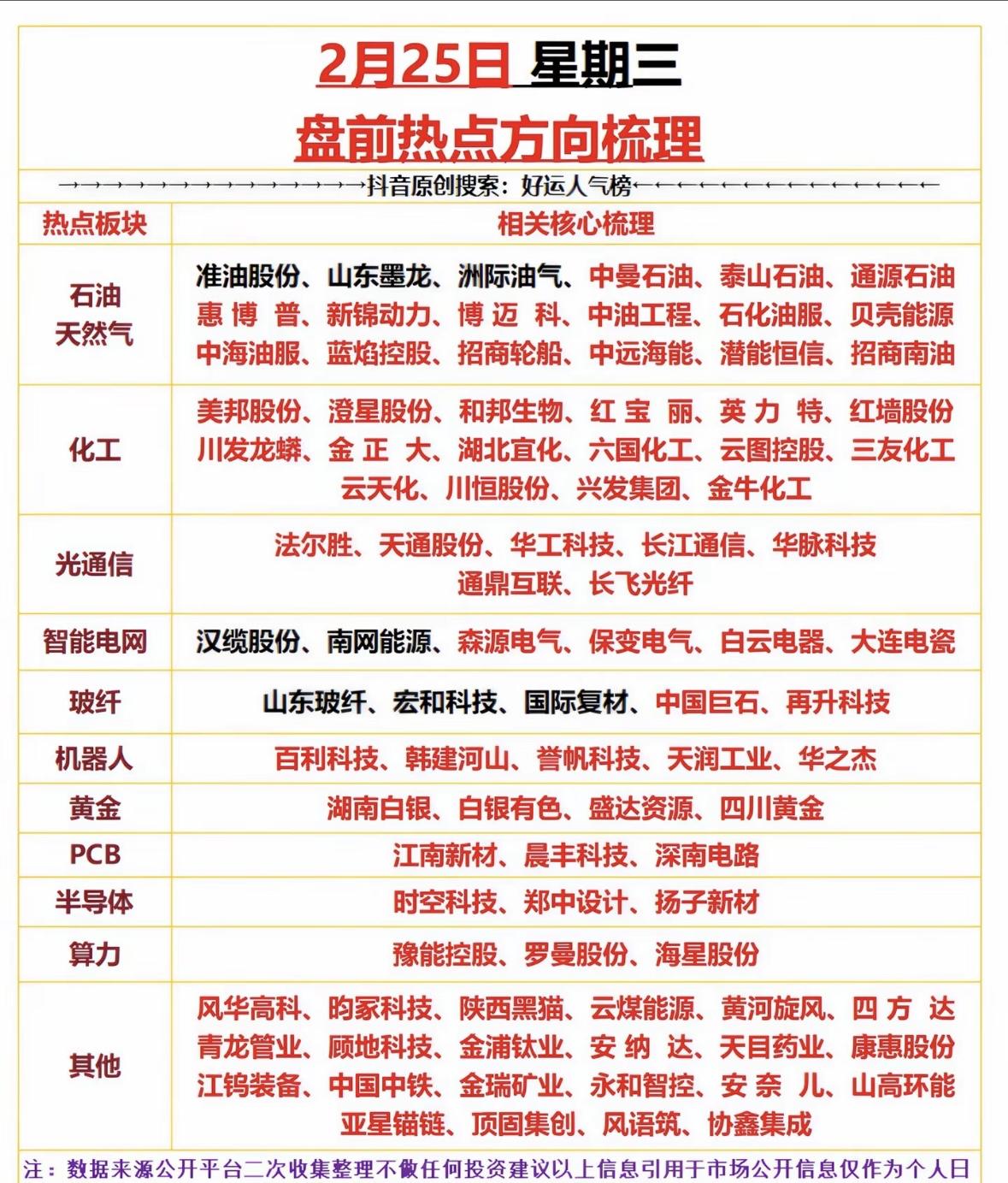 2月25日盘前热点方向得好好梳理梳理,这可是抓住市场机会的关键。从近期的情况来看,科技板块或许有机会。比如半导体行业,随着技术不断发展,对芯片的需求持续增长,相关企业有望迎来业绩提升。新能源领域也值得关注,像新能源汽车,销量不断创新高,产业链上下游企业都有不错的潜力。还有大消费板块,随着经济复苏,人们消费意愿增强,食品饮料、旅游等细分领域可能会有不错的表现。不过,市场变化莫测,大家还得结合自身情况,谨慎做出投资决策。