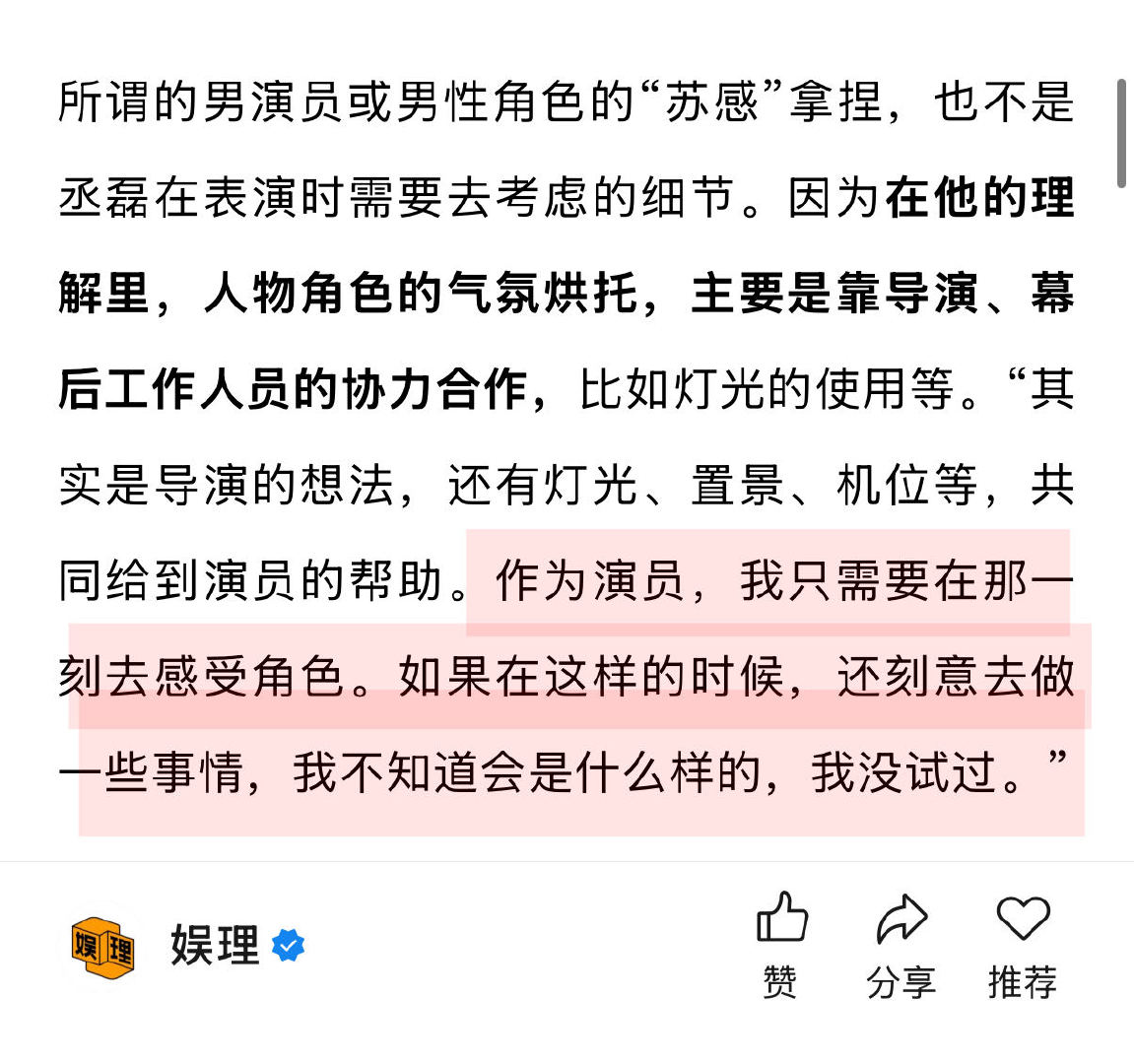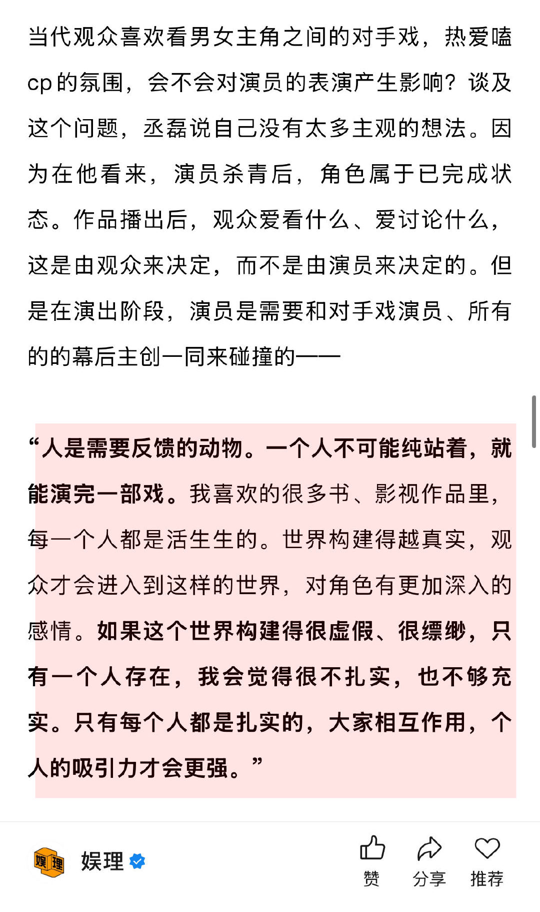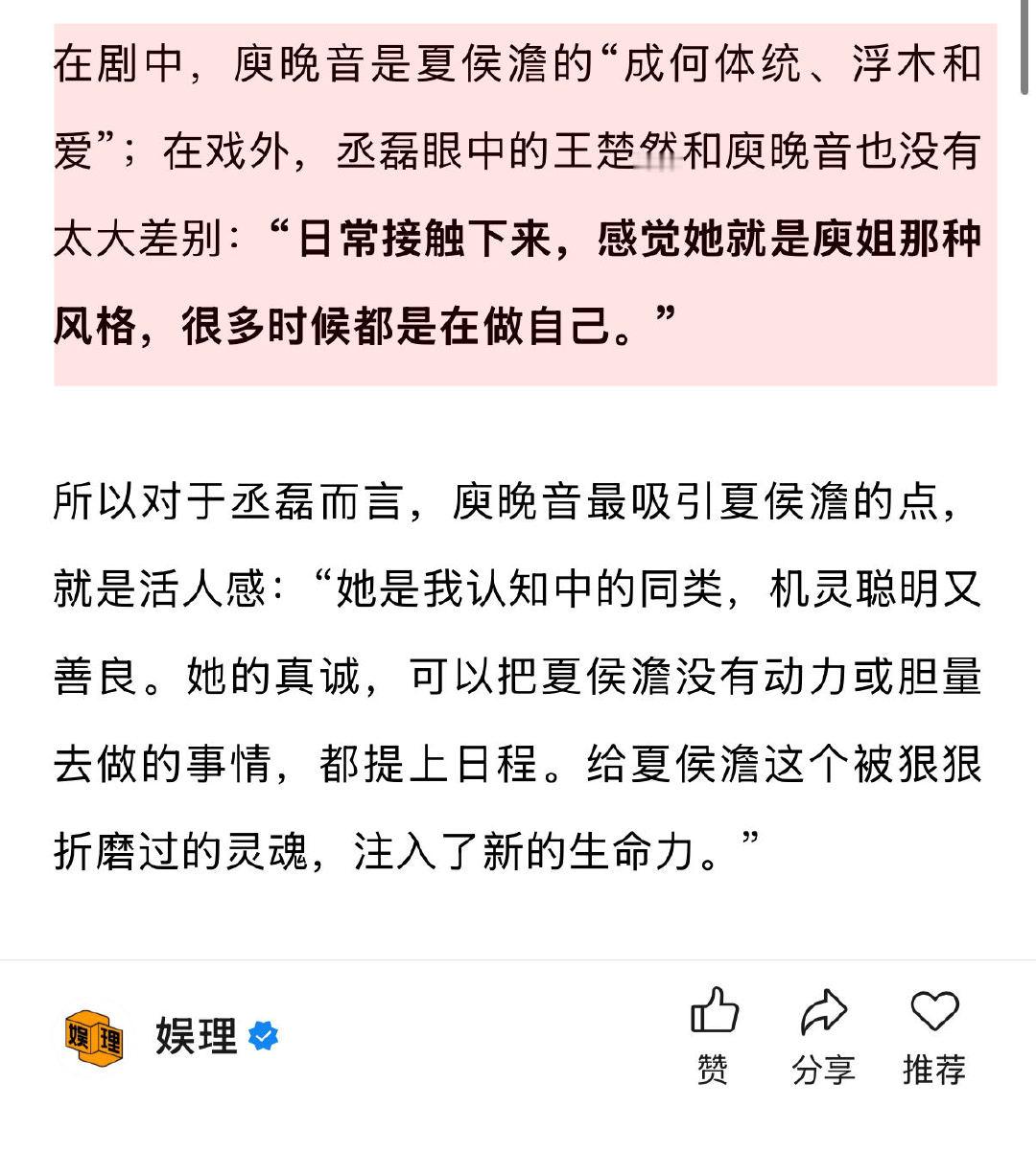 丞磊说自己和王楚然挺同频的 丞磊回应观众追剧爱嗑CP 在《成何体统》中,庾晚音是夏侯澹的“成何体统、浮木和爱”;在戏外,眼中的王楚然和庾晚音也没有太大差别:“日常接触下来,感觉她就是庾姐那种风格,很多时候都是在做自己。”所以对于丞磊而言,庾晚音最吸引夏侯澹的点,就是活人感…娱理独家↓