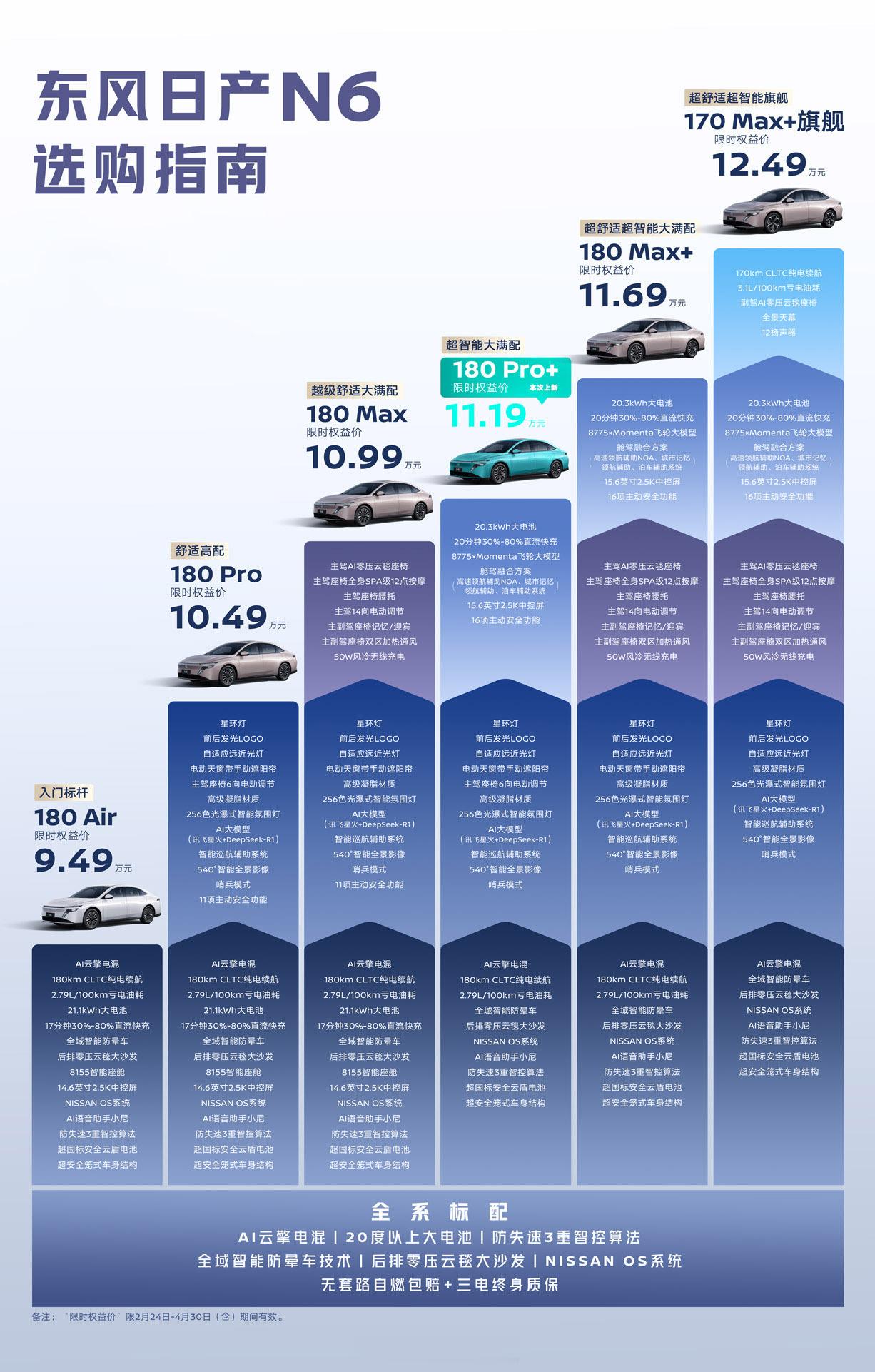 这次四款新车中,还很有意思的是N6上了一款Pro+,比之前的180Max贵了2000元,但是换了宁德时代电池,同时增加了8775芯片、15.6英寸大屏和Momenta智驾,但是砍掉了AI零压云毯座椅。或许东风日产是从终端上得到了反馈,年轻消费者对智能化需求更高,包括智驾的需求和大屏的需求,而不在意AI座椅。还有就是,宁德时代的电池就是销量保证,所以东风日产才有了一个追加。