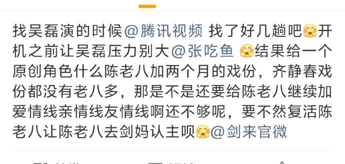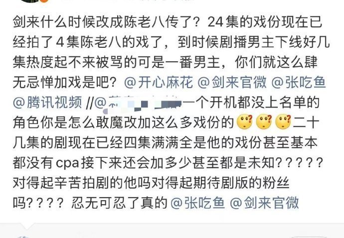 吴磊粉丝向《剑来》官博以及腾讯维权,存在原创角色大量加戏的情况,一共24集居然加了4集体量,这太离谱了,支持三石粉丝维权!!!