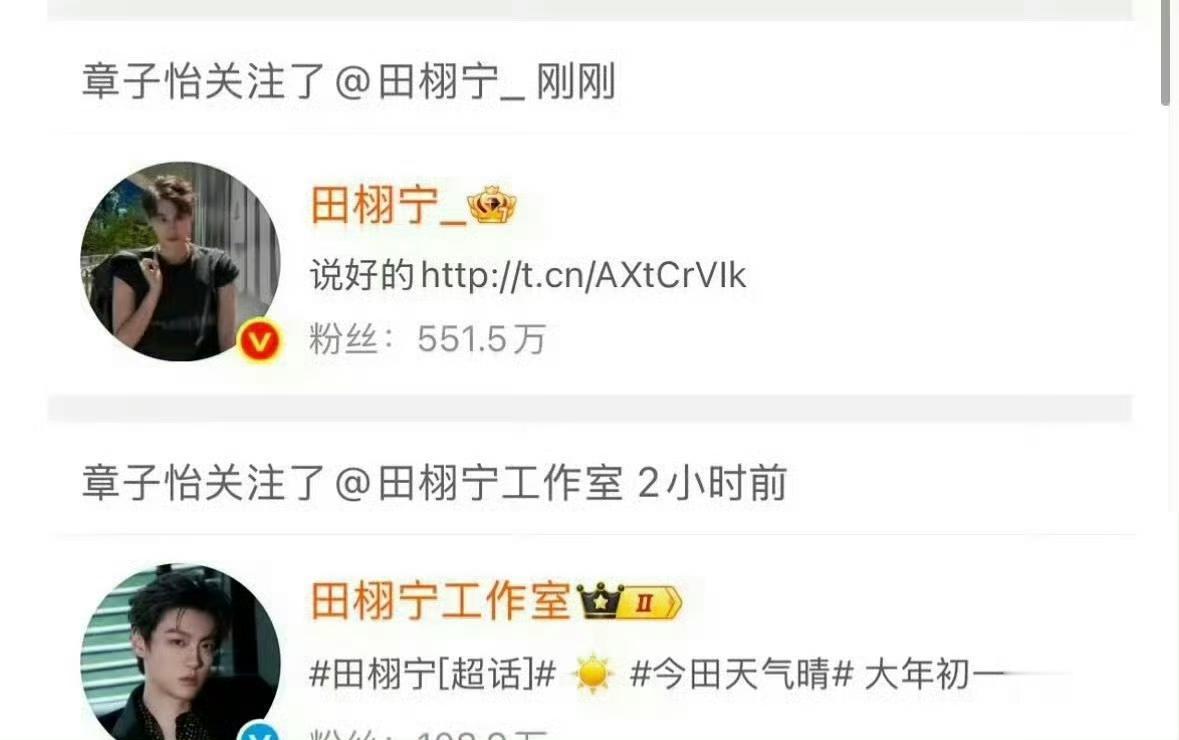 章子怡关注田栩宁的微博后,热搜爆了! 路人是有点意外,这两个人怎么认识的? 她的粉丝却崩溃了! 直接喊话夹总让注销章子怡的微博,还自我安慰道, “姐姐也许是手滑了!毕竟以前也有过这种情况。“ 看章子怡先后关注了田栩宁工作室和他本人,就知道这不可能是手滑。 应该是接下来已经敲定要合作了。 大概率会是章子怡的导演首作。