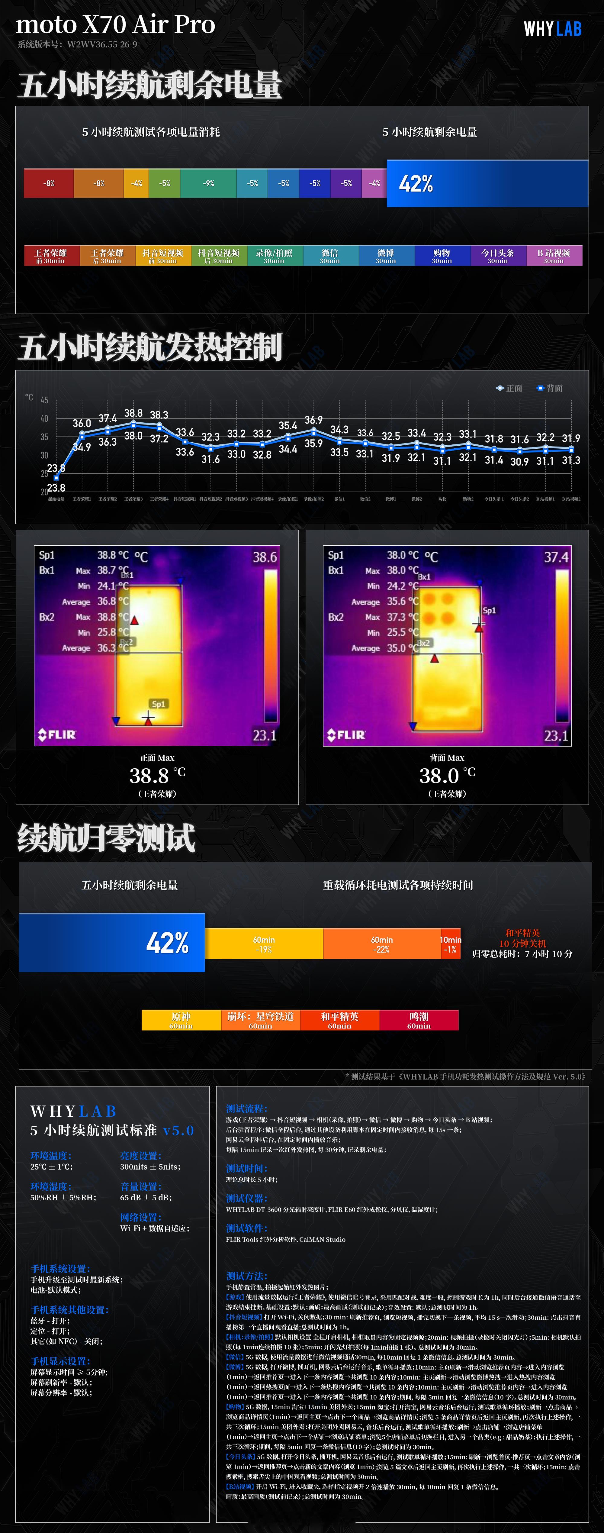 ➢ 🔋 续航:搭载 5200mAh 第三代星海刀锋电池,五小时续航剩余 58%,各环节最高温集中在游戏场景 —— 正面最高 38.8℃、背面最高 38.0℃;续航归零总时长 7 小时 10 分,覆盖全天轻度至中度使用;