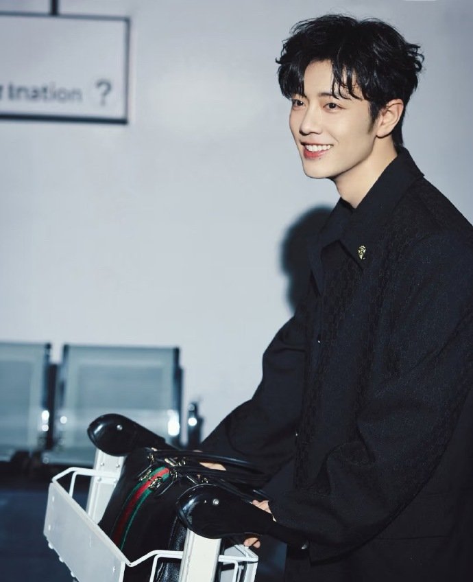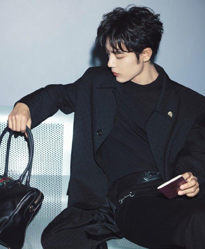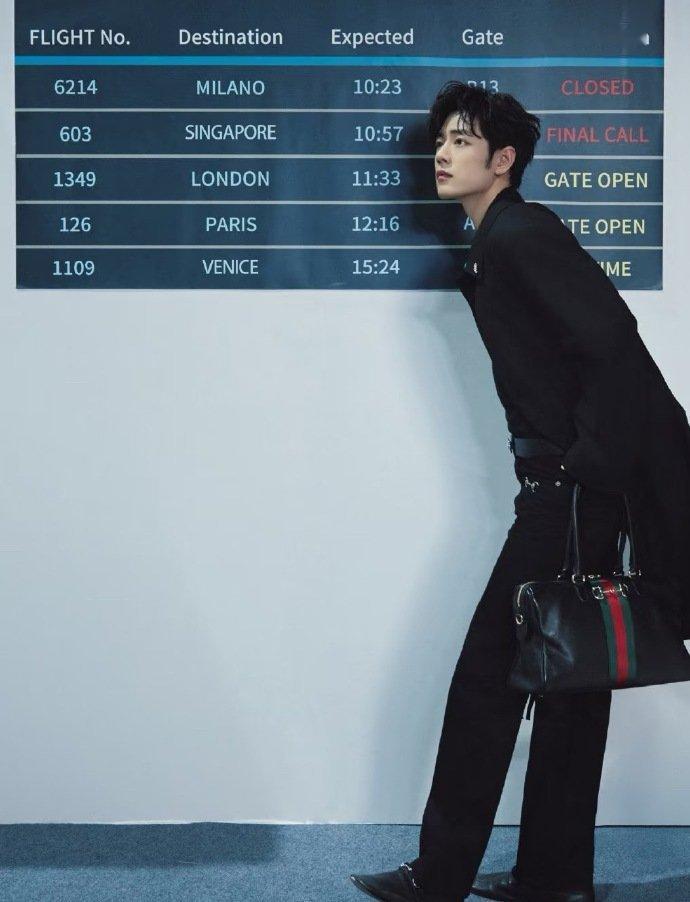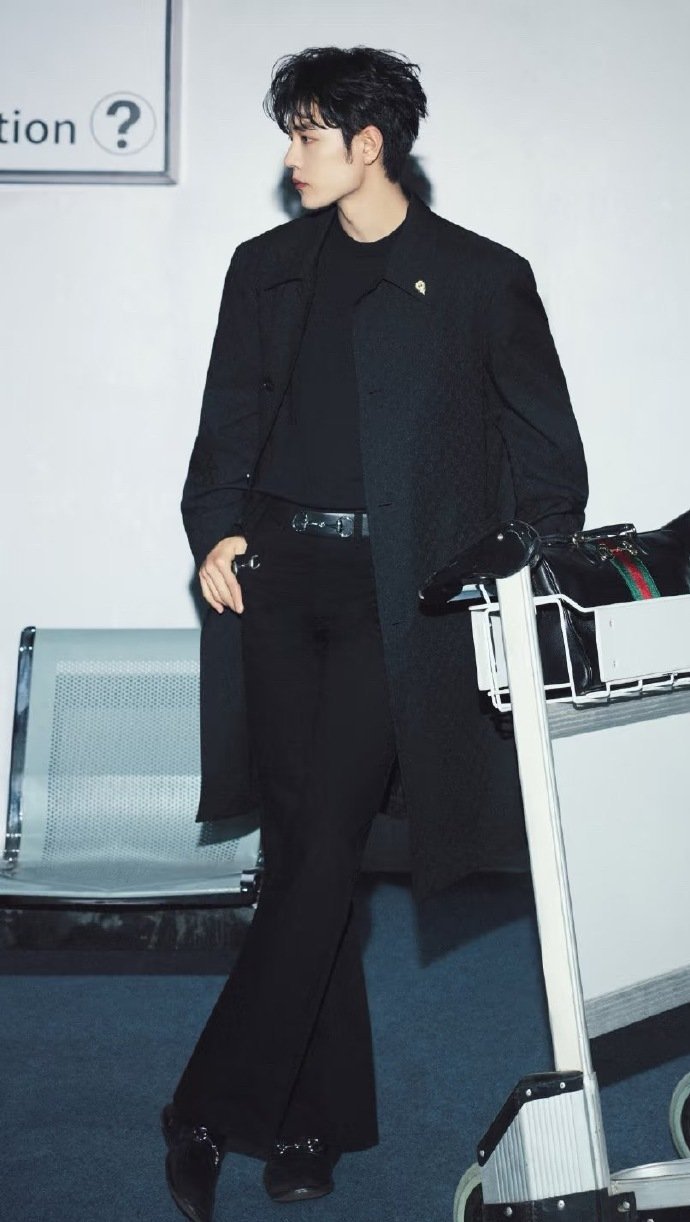 肖战Gucci时装周出发图,有风度有格调,All Black造型,暗纹老花风衣搭配抢眼的马衔扣装饰腰带、手袋和乐福鞋,低调但不失细节,一出剧组就变时尚潮男了