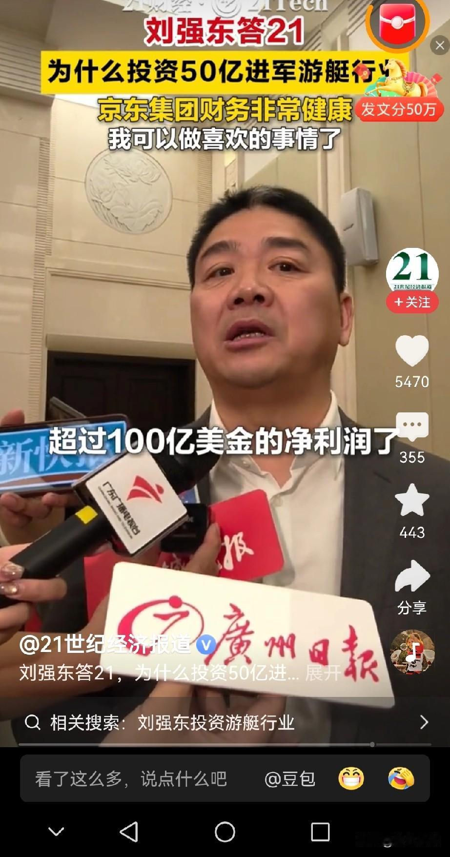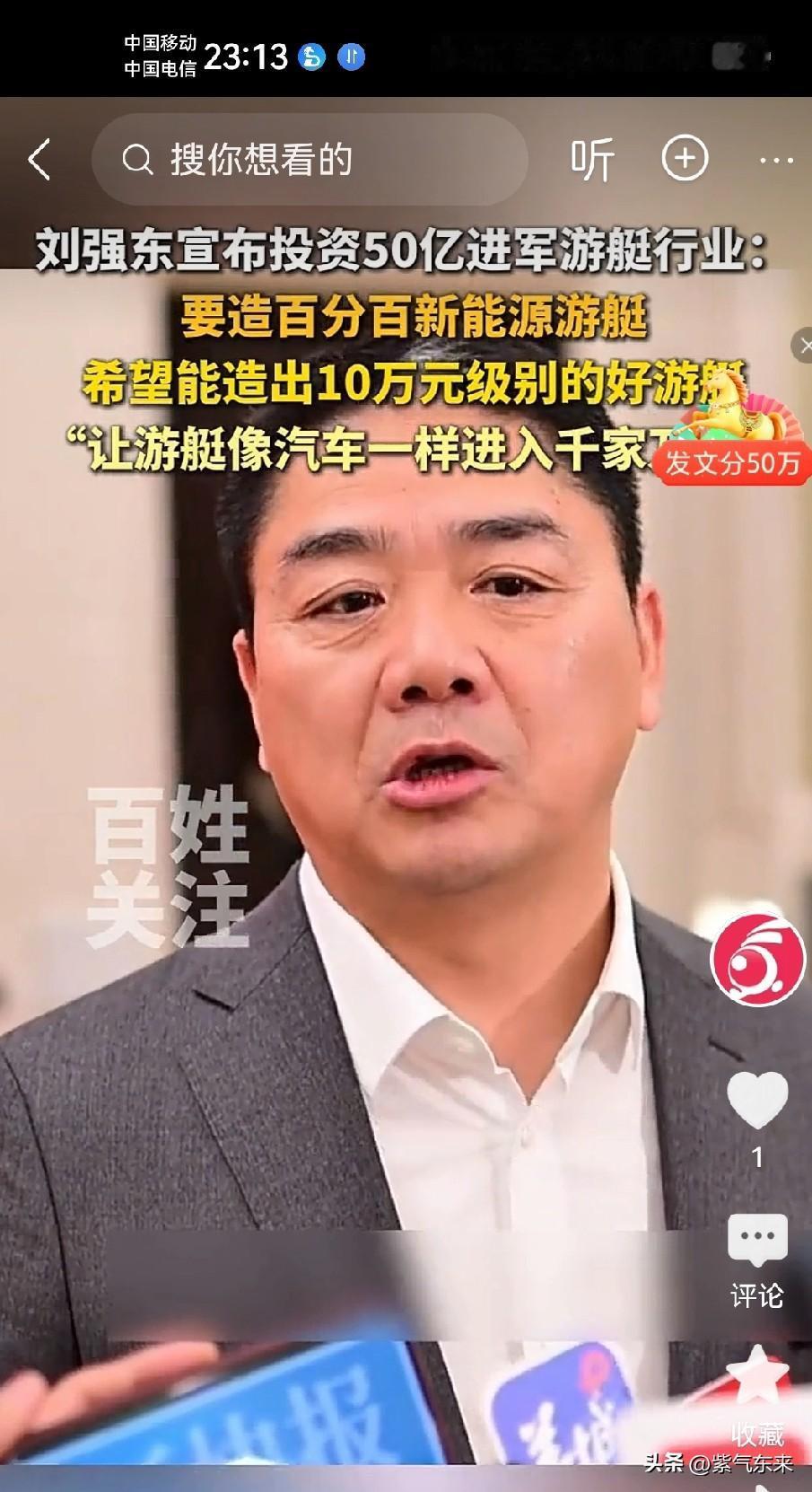 刘强东宣布:个人投资50亿进军游艇行业 非常看好游艇的前景! 之所以选择游艇行业完全是为了完成儿时的愿望,儿时梦想成为一名船长! 如今的京东已经财大气粗,平稳有序健康发展,尤其是财务非常健康! 京东全年净利润超过100亿美金! 看来刘强东对中国未来的经济很看好, 刘强东称:要造出百分百的新能源游艇,希望能造10万级别的游艇,让游艇跟汽车一样,走进千家万户! 游艇不是汽车,不是生活的必需品,是有钱人的工具! 刘强东的想法是好的,但是有点不现实!刘强东 京东发展战略