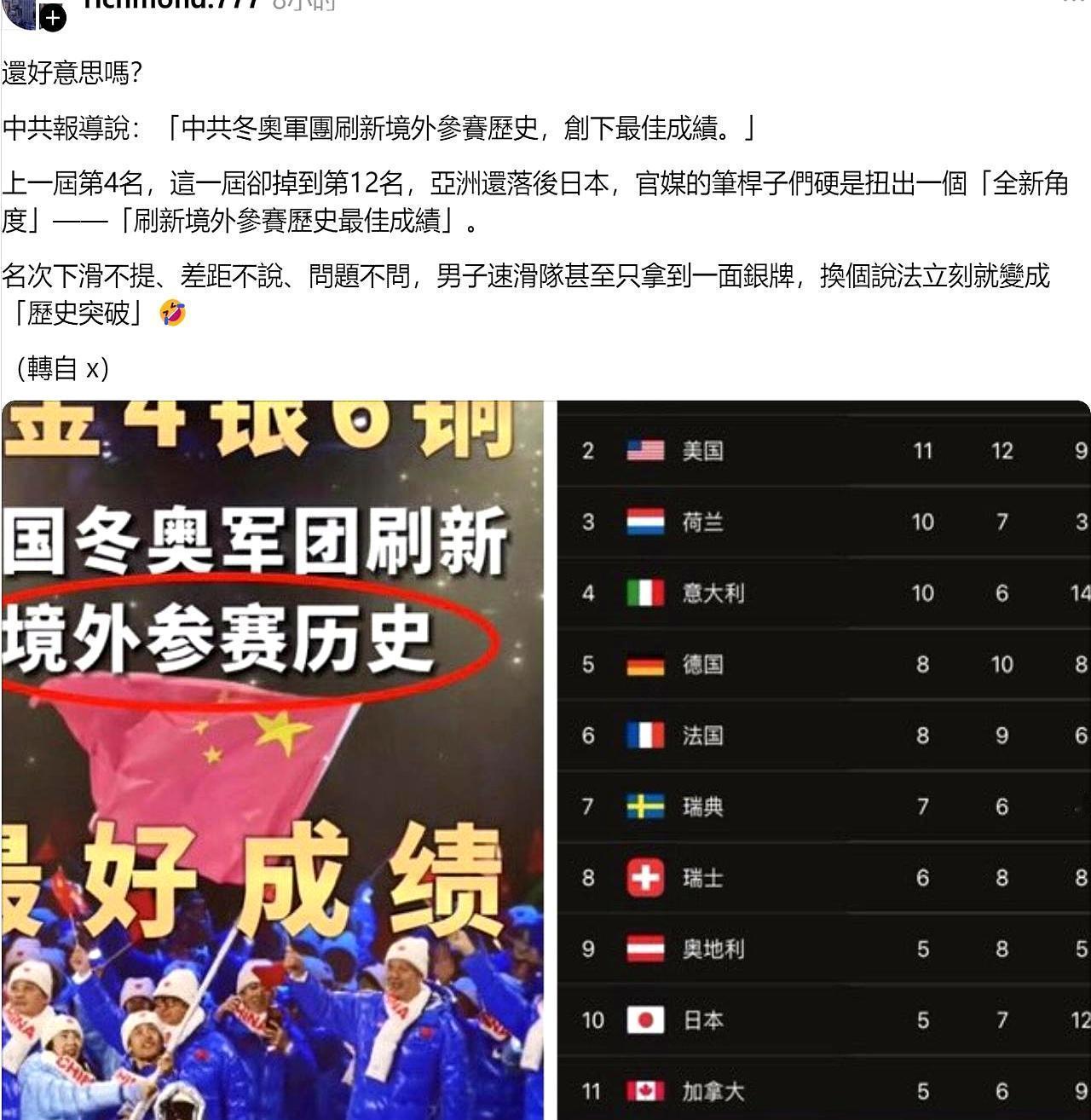 冬奥会最魔幻的一幕,是岛上一群人,拿着0奖牌的成绩单,去狂欢隔壁的胜利。 他们指着奖牌榜,说你看,中国这次不如日本,输了。字里行间,透着一股扬眉吐气的兴奋。 可笑的是,他们好像忘了,我们这次是客场作战,已经创了境外历史最好成绩。更忘了,自己2300万人,连一块铁牌子都没摸到。 一边骂我们是金牌机器,一边又拿着奖牌榜当令箭。这到底是在嘲讽谁? 人一旦没了脊梁,看谁都像是自己的主子。