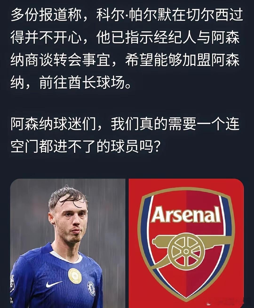 帕尔默要是加盟阿森纳就好玩了…他从小是曼城培养球员,绝对的曼彻斯特人。最讨厌的球队都是利物浦,在切尔西效力没冠军,去阿森纳一起夺冠呀。足球英超阿森纳