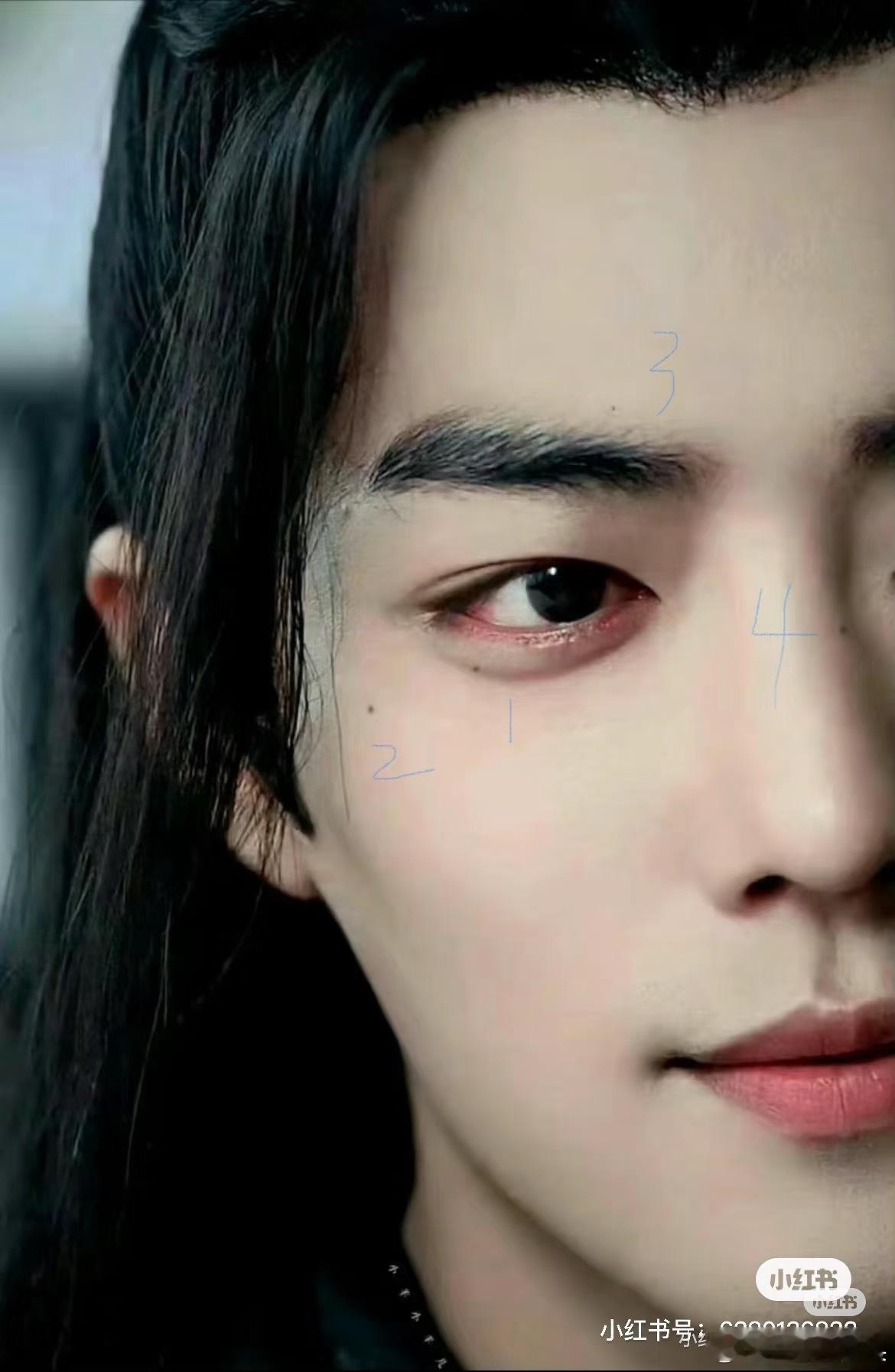 如果沿着肖战的痣亲他,你就能从眉上顺着鼻梁,脸颊,眼角,耳朵,唇下,下巴,脖子这样亲。