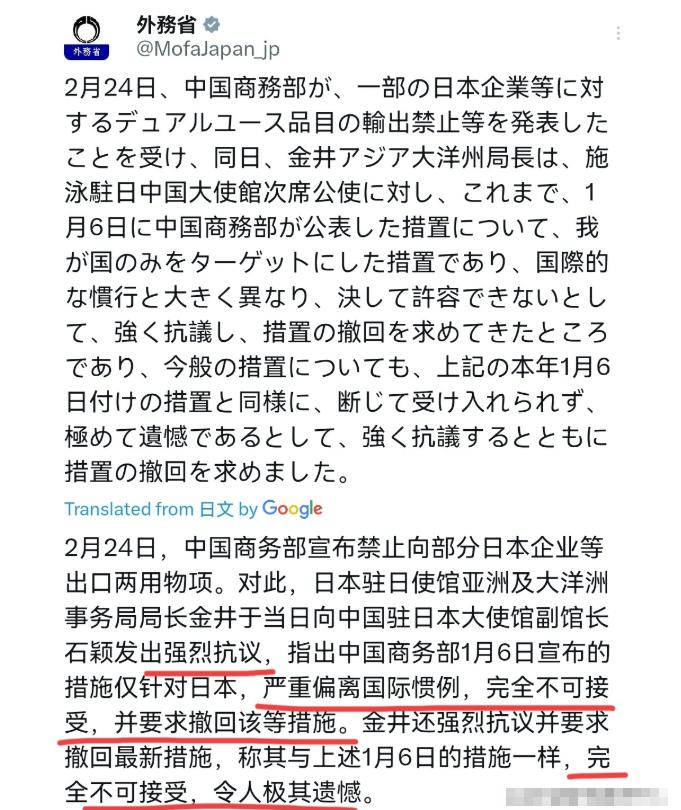 日本出来回应了!在我们将20家日本实体纳入管制清单之后,日本非常的愤怒! 2月24日,日本外务省发表声明声称,中国商务部宣布对部分日本企业等实施两用物项出口禁令,日本已经对中国驻日本大使馆公使提出交涉。此前,针对中国商务部1月6日公布的相关措施,日本方面已明确表示:该措施仅以日本为对象,与国际通行惯例严重不符,绝对无法接受,并已提出强烈抗议,要求中方撤销相关措施。 日本内阁官房副长官佐藤启也在当天的记者会上公开表态,宣称中方的做法“绝对不可接受,极其令人遗憾”,一套说辞下来,仿佛自己是受了天大委屈的受害者,却压根不提中方为什么会出台这些措施,更不提日本近期一系列挑衅中方的行为。 其实日本的愤怒,根本不是因为什么“与国际通行惯例严重不符”,而是因为这20家实体被管制后,直接戳中了它的痛处,当天东京股市的防务和重型机械板块就遭遇了大规模抛售。 有明确数据显示,三菱重工股价当天由涨转跌,最终收跌3.1%,IHI株式会社跌幅更是达到5.73%,川崎重工也下跌了4.02%,这几家企业都是日本军工领域的支柱,平时靠着从中国进口的两用物项维持生产,现在被切断了供应,生产必然会受到严重影响,股价下跌就是最直接的体现。 面对这种局面,这些日本企业也彻底慌了神,三菱重工对外表示正在“调查”此事,IHI称会“核实事实并密切关注事态发展”,川崎重工则说要“确认中国出口限制的具体内容”,一个个都没了平时的底气。 日本嘴上喊着中方措施“与国际通行惯例严重不符”,这话听着就格外可笑,纯属典型的双标行为,要知道,之前日本一直跟着美国的步伐,多次制裁中国企业,限制中国相关技术的出口,那时候它怎么不说不符合国际惯例?怎么不觉得不可接受? 现在轮到自己的军工企业被管制,影响到自己的军事扩张计划和经济利益了,就急得跳脚,又是抗议又是交涉,说白了就是自私自利,只许自己放火,不许别人点灯。 而且早在1月6日,中方就已经公布了加强两用物项对日出口管制的相关措施,当时日本就已经明确表示无法接受,提出了强烈抗议,还要求中方撤销措施,可中方根本没有理会,因为中方的所有措施,都是依据《中华人民共和国出口管制法》和《中华人民共和国两用物项出口管制条例》等法律法规制定的,目的就是制止日本的“再军事化”和拥核企图,完全正当、合理、合法。 中方的措施仅针对少数参与日本军事扩张的实体,只限制两用物项的出口,并不会影响中日之间的正常经贸往来,那些诚信守法、不涉及军事领域的日本民用企业,根本不需要担心。 更何况,日本近期的挑衅行为从来就没有停止过,日本首相高市早苗在2月20日的国会施政演说中,还明确将中国列为首要安全威胁,宣布年内要修订三份安全战略文件,还要依托日美同盟,以“集体自卫权”为借口介入台海,2月12日更是以“无视停船命令”为由,强行扣押中国渔船,种种行为都在不断挑战中方的底线。 中方这次将20家日本实体纳入管制,就是对这些挑衅行为的有力反制,也是给日本敲响警钟,让它知道中方的耐心是有限的,一旦触碰核心利益,必然会遭到坚决反制。 日本现在的愤怒,本质上就是不甘心自己的军事扩张计划被打断,不甘心自己的既得利益受损,可这都是它咎由自取,如果日本不一直执着于搞军事扩张,不频频挑衅中方的核心利益,中方也不会出台这些管制措施,说到底,还是日本自己搬起石头砸自己的脚。 之前日本针对中方1月6日公布的措施,就已经提出过抗议,现在中方出台更精准的实体管制措施,日本的愤怒只会更甚,但再多的抗议也没用,中方的态度非常明确,只要日本还在推进“再军事化”,还在挑衅中方,中方就会根据局势发展,采取更严厉的反制措施,日本要是识相,就该及时反思自己的行为,停止挑衅,否则只会付出更沉重的代价。