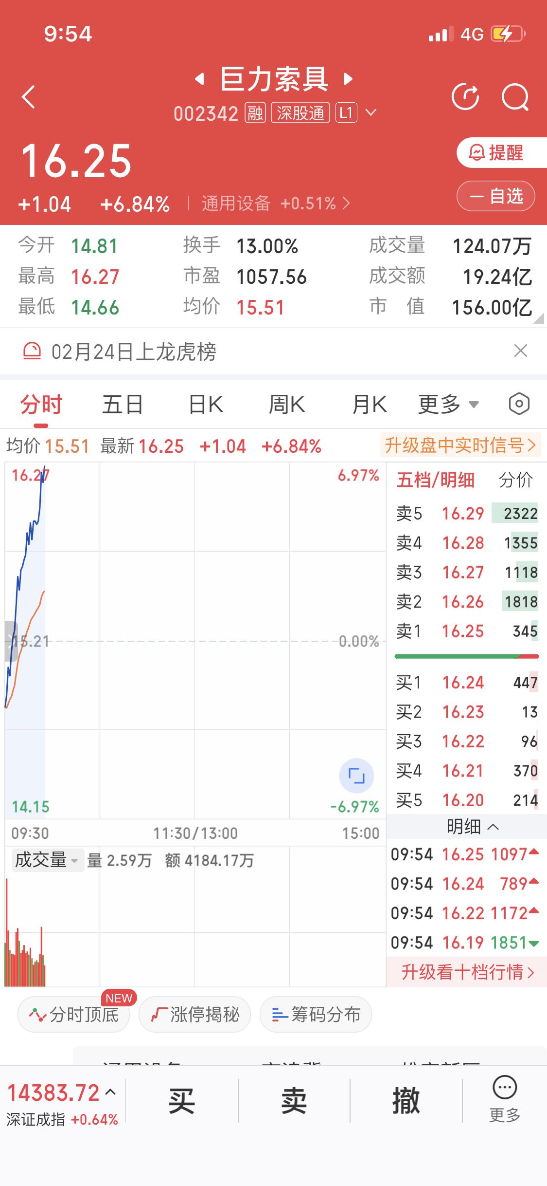 这巨力索具的走势真是让人捉摸不透啊!2月25日前几天还遭遇跌停,那场面估计让不少股民心里“凉凉”,感觉要被深度套牢了。 可没想到,昨天还在水下挣扎呢,就被一股神秘力量捞起,这剧情反转得比电视剧还精彩。今天更是直接大涨,那些坚持没割肉的股民估计都乐开了花。这也再次证明了股市的不确定性,说不定哪只股票就突然上演绝地反击。不过,这大涨背后也不知道是啥原因,是有新的利好消息,还是主力资金在搞事情?只能说,炒股真是一场刺激的冒险。