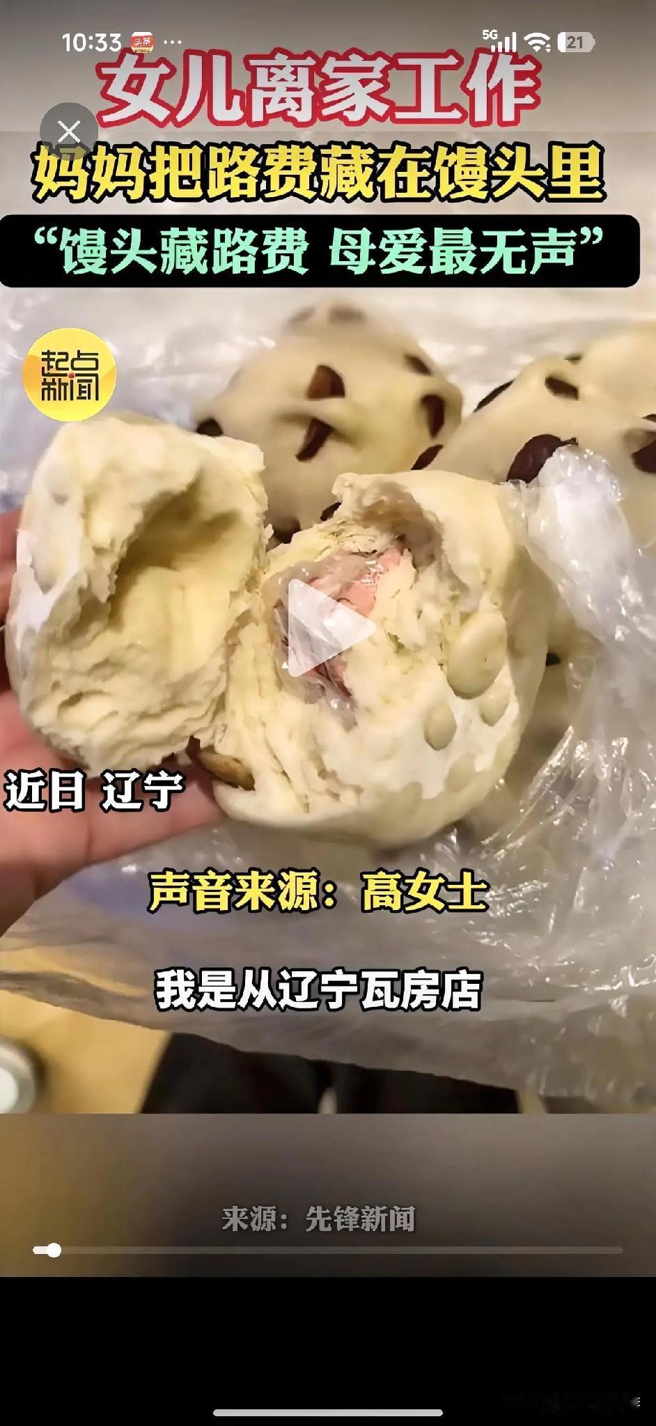 馒头馅是钱!妈妈把钱包在馒头里送女儿,看的眼圈红红! 女儿家住辽宁,在西安工作,春节回家,妈妈给女儿钱她不要,觉得爸爸妈妈很辛苦不能妈妈的钱,在离家路上,妈妈给女儿发信息,说馒头里有一千块钱! 妈妈把这无声的爱藏在了馒头里,看到掰开的馒头里面的钱时候,感到眼底发烫,她担心孩子在外面受委屈,尽自己所能也要给孩子安慰,看到的不只是那一千块钱,而是这份谁也替代不了的世上唯一的妈妈的爱! 父母给儿女红包 辽宁 西安 图片来源每日甘肃