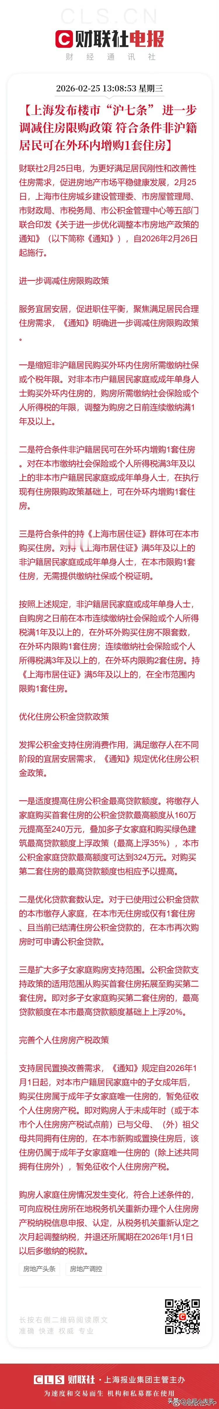 核心要点: • 非沪籍社保/个税满1年,外环内可购1套,外环外不限套数 • 满3年可在外环内购2套,享本地家庭同等待遇 • 居住证满5年,全市可购1套,无需社保个税 • 公积金首套最高贷240万,多子女家庭再上浮 上海虹吸效应拉满,购买力集中回流,环沪城市压力不小。[允悲]