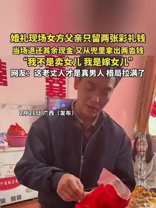 女儿出嫁,父亲举动暖人心。他不仅退回男方彩礼,还额外送上两沓现金,深情表示:“彩礼是形式,女儿幸福才是真。这钱是给小两口的生活助力。”父爱如山,这份豁达与疼爱,让婚礼更添温情与感动。女儿定亲彩礼