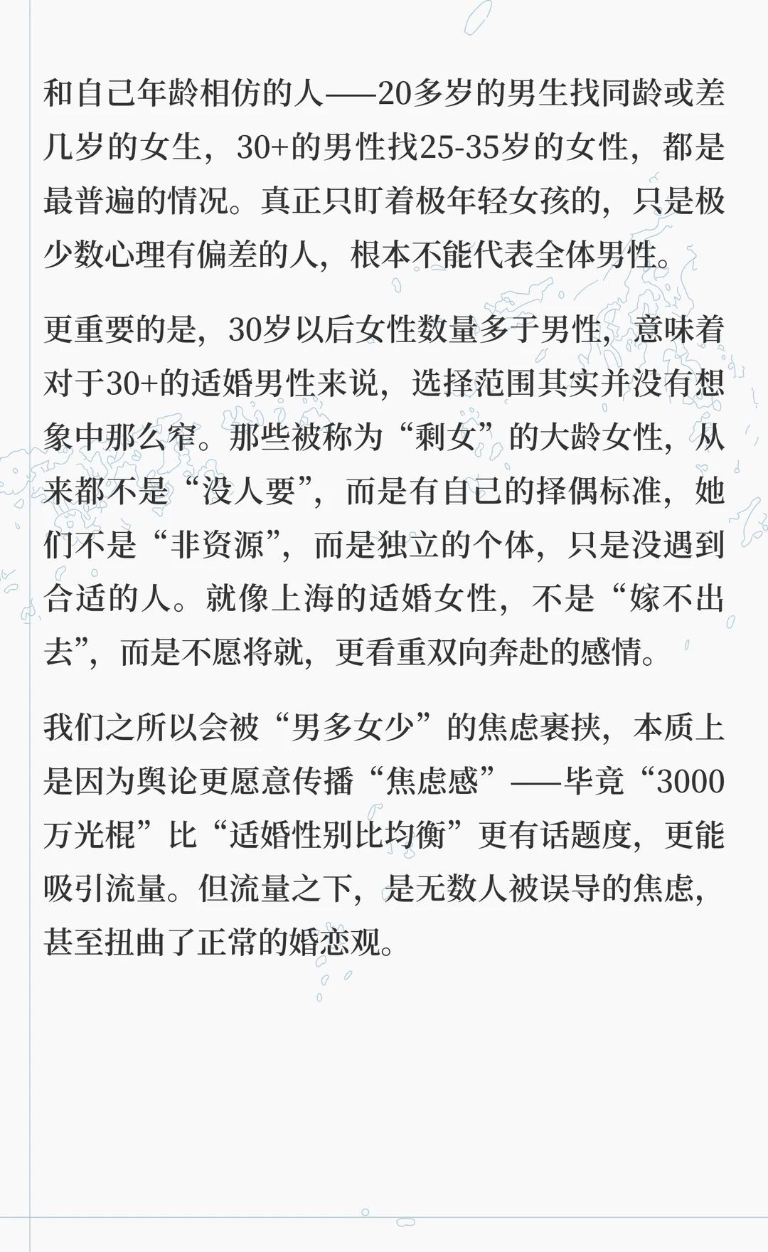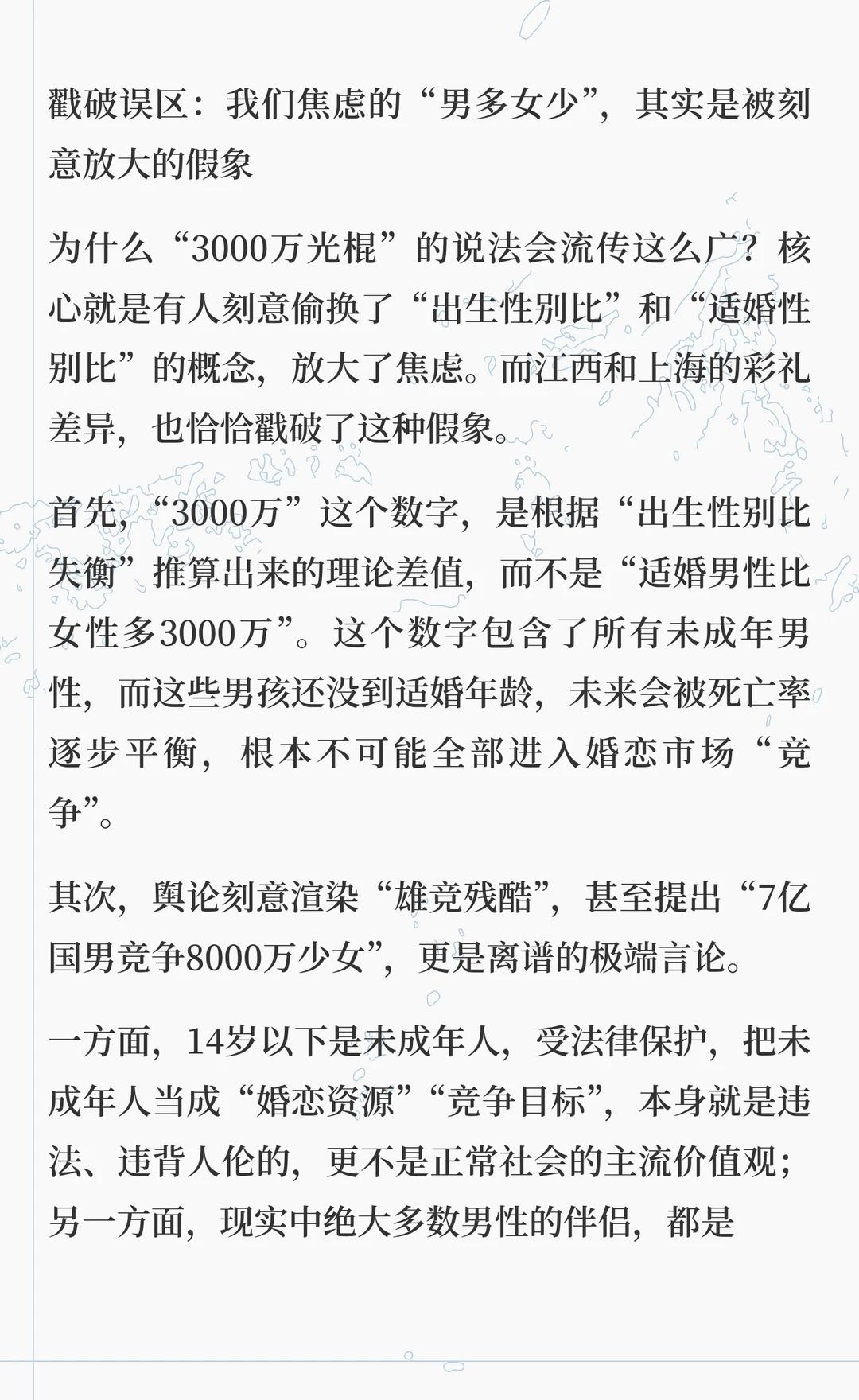 性别比真相(四) 四、戳破误区:我们焦虑的“男多女少”,其实是被刻意放大的假象 为什么“3000万光棍”的说法会流传这么广?核心就是有人刻意偷换了“出生性别比”和“适婚性别比”的概念,放大了焦虑。而江西和上海的彩礼差异,也恰恰戳破了这种假象。 首先,“3000万”这个数字,是根据“出生性别比失衡”推算出来的理论差值,而不是“适婚男性比女性多3000万”。这个数字包含了所有未成年男性,而这些男孩还没到适婚年龄,未来会被死亡率逐步平衡,根本不可能全部进入婚恋市场“竞争”。 其次,舆论刻意渲染“雄竞残酷”,甚至提出“7亿国男竞争8000万少女”,更是离谱的极端言论。 一方面,14岁以下是未成年人,受法律保护,把未成年人当成“婚恋资源”“竞争目标”,本身就是违法、违背人伦的,更不是正常社会的主流价值观;另一方面,现实中绝大多数男性的伴侣,都是和自己年龄相仿的人——20多岁的男生找同龄或差几岁的女生,30+的男性找25-35岁的女性,都是最普遍的情况。真正只盯着极年轻女孩的,只是极少数心理有偏差的人,根本不能代表全体男性。 更重要的是,30岁以后女性数量多于男性,意味着对于30+的适婚男性来说,选择范围其实并没有想象中那么窄。那些被称为“剩女”的大龄女性,从来都不是“没人要”,而是有自己的择偶标准,她们不是“非资源”,而是独立的个体,只是没遇到合适的人。就像上海的适婚女性,不是“嫁不出去”,而是不愿将就,更看重双向奔赴的感情。 我们之所以会被“男多女少”的焦虑裹挟,本质上是因为舆论更愿意传播“焦虑感”——毕竟“3000万光棍”比“适婚性别比均衡”更有话题度,更能吸引流量。但流量之下,是无数人被误导的焦虑,甚至扭曲了正常的婚恋观。打破性别刻板印象 男女
