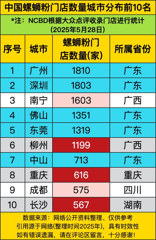 咱平时就爱嗦那酸辣开胃的螺蛳粉,可你知道全国哪里螺蛳粉门店最多吗?瞅瞅这组数据,2025年5月28日统计的中国螺蛳粉门店数量城市分布前十名,那可真是有意思极了。广州以1810家稳坐榜首,感觉在广州的大街小巷,每隔几步就能闻到那股熟悉的螺蛳味儿,妥妥的螺蛳粉“大户”。 再瞧瞧深圳,紧随其后,有1803家呢。这俩广东城市,在螺蛳粉门店数量上那是你追我赶,竞争相当激烈。看来广东人对螺蛳粉的喜爱程度不一般呐。想想也是,螺蛳粉独特的风味,很是符合广东人追求新奇又爱美食的口味特点,估计不少人隔三岔五就得来上一碗解解馋。 广西作为螺蛳粉的发源地,南宁和柳州的表现也相当亮眼。南宁有1603家,柳州有1199家。家乡的味道总是深入人心,广西人在自家门口就能轻松嗦到各种美味的螺蛳粉。说不定还能吃到一些当地独有的特色螺蛳粉呢,毕竟发源地的美食创新也是层出不穷。 除了这些靠前的城市,重庆、成都、长沙也榜上有名。重庆616家,成都575家,长沙567家。这些城市的吃货们对螺蛳粉也是青睐有加呀。而且这些地方本身美食文化就丰富,螺蛳粉能在这里占有一席之地,可见它的魅力有多大。不知道在这些城市里,哪家螺蛳粉店的口味最正宗,最能抓住吃货们的心呢!