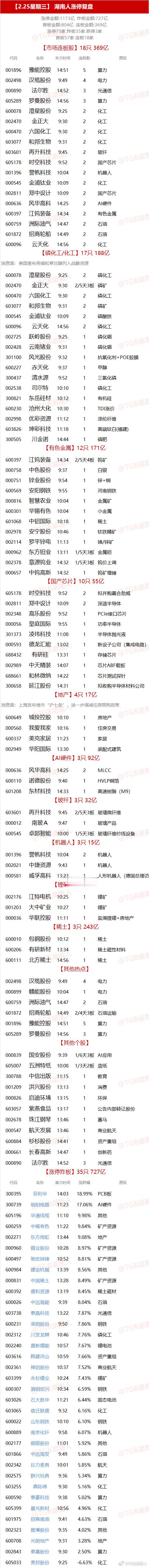 【2.25星期三】 湖南人涨停复盘 "涨停金额:1173亿 炸板金额:727亿首板金额:804亿 连板金额:369亿涨停75家 炸板35家 跌停3家首板57家 连板18家" 【市场连板股】18只 369亿 代码 名称 末次时间 连板数 原因001896 豫能控股 14:51 5 算力002498 汉缆股份 9:49 4 电力000890 法尔胜 14:52 3 光通信605289 罗曼股份 14:56 3 算力600078 澄星股份 9:25 2 化工002470 金正大 9:30 2 化工600470 六国化工 9:30 2 化工603077 和邦生物 9:31 2 化工603601 再升科技 9:45 2 玻纤605178 时空科技 9:52 2 国产芯片001396 誉帆科技 10:04 2 机器人000545 金浦钛业 10:09 2 化工002811 郑中设计 10:09 2 国产芯片000636 风华高科 14:25 2 AI硬件600397 江钨装备 14:34 2 有色金属600759 洲际油气 14:47 2 石油601872 招商轮船 14:49 2 石油600096 云天化 14:56 2 化工【磷化工/化工】17只 188亿 消息面:美国宣布将磷和草甘膦列入战略资源 600078 澄星股份 9:25 2 磷化工002470 金正大 9:30 2/5天3板 磷矿600470 六国化工 9:30 2 磷化工603077 和邦生物 9:31 2 磷矿000545 金浦钛业 10:09 2 磷酸铁600096 云天化 14:56 2 磷化工002725 跃岭股份 9:25 1 磷化铟002428 云南锗业 9:31 1 磷化铟301100 风光股份 9:32 1 抗氧化剂+POE胶膜600227 赤天化 9:37 1 甲醇300437 清水源 9:52 1 三氯化磷002538 司尔特 10:10 1 磷化工300821 东岳硅材 10:12 1 有机硅600230 沧州大化 10:30 1 TDI涨价002998 优彩资源 11:12 1 涤纶纤维603826 坤彩科技 11:18 1 高端钛白(福建)300505 川金诺 14:44 1 磷肥【有色金属】12只 171亿 600397 江钨装备 14:34 2/5天4板 钨矿000758 中色股份 9:37 1 白银000751 锌业股份 9:54 1 锌+铜600569 安阳钢铁 9:55 1 河南钢铁000816 智慧农业 10:04 1 金属矿600301 华锡有色 10:04 1 小金属601068 中铝国际 10:18 1 稀土002978 安宁股份 10:46 1 钛铁精矿002114 罗平锌电 11:13 1 锗/锌矿000962 东方钽业 13:11 1/5天3板 金属钽002378 章源钨业 14:32 1/5天3板 钨价上调000657 中钨高新 14:32 1 钨矿增储【国产芯片】10只 55亿 605178 时空科技 9:52 2 拟并购嘉合劲威002811 郑中设计 10:09 2 深迪半导体002348 高乐股份 9:52 1 PCIe接口芯片000056 皇庭国际 9:55 1 功率半导体301373 凌玮科技 11:08 1 半导体抛光液000593 德龙汇能 13:02 1 新设子公司(集成电路)688432 有研硅 13:31 1 存储芯片002989 中天精装 14:07 1 芯片ABF载板688661 和林微纳 14:22 1 芯片测试探针300658 延江股份 14:31 1 拟收购半导体材料公司【地产】4只 17亿 消息面:上海发布楼市“沪七条”,进一步调减住房限购政策 600649 城投控股 10:10 1 房地产000560 我爱我家 10:16 1 住房交易600337 美克家居 11:23 1 家居002949 华阳国际 13:30 1 装配式建筑【AI硬件】3只 92亿 000636 风华高科 14:25 2 MLCC600110 诺德股份 9:40 1 HVLP铜箔601208 东材科技 14:33 1 高速树脂(M9)【玻纤】3只 32亿 603601 再升科技 9:45 2/5天3板 玻璃微纤维000012 南玻A 9:47 1 玻璃产品600545 卓郎智能 10:00 1/5天3板 玻璃纤维纱线设备【机器人】3只 15亿 001396 誉帆科技 10:04 2 机器人002021 中捷资源 9:43 1 机器人000581 威孚高科 13:23 1 人形机器人(德国总理访华)【锂矿】3只 28亿 002176 江特电机 10:25 1 锂矿001203 大中矿业 10:27 1 锂矿000036 华联控股 11:11 1 盐湖提锂+房地产【稀土】3只 243亿 600010 包钢股份 10:12 1 稀土600206 有研新材 13:34 1 稀土磁性材料600111 北方稀土 14:56 1 稀土【其他热点】 002498 汉缆股份 9:49 4 电力000899 赣能股份 10:04 1 电力600759 洲际油气 14:47 2 石油601872 招商轮船 14:49 2/4天3板 石油运输001896 豫能控股 14:51 5 算力605289 罗曼股份 14:56 3 算力【其他个股】 000839 国安股份 9:39 1/6天3板 AI应用605007 五洲特纸 10:08 1/3天2板 造纸300788 中信出版 11:15 1 教育001209 洪兴股份 13:13 1 消费000826 启迪环境 13:15 1 环保603057 紫燕食品 13:17 1 公告内部转让股份002678 珠江钢琴 13:46 1 赛马000547 航天发展 13:46 1 商业航天600884 杉杉股份 14:41 1 资产重组000661 长春高新 14:47 1 创新药000890 法尔胜 14:52 3 光通信【涨停炸板】35只 727亿 代码 名称 首次时间 涨跌幅 原因300395 菲利华 14:03 18.99% PCB板300739 明阳电路 11:23 17.06% AI硬件605196 华通线缆 11:10 9.98% 其他600259 中稀有色 11:22 9.84% 矿产资源002271 东方雨虹 13:44 9.08% 地产000960 锡业股份 10:28 8.97% 矿产资源600497 驰宏锌锗 10:52 8.81% 矿产资源600984 建设机械 13:39 8.56% 其他000831 中国稀土 13:28 8.49% 矿产资源600392 盛和资源 13:19 8.45% 稀土磁材600026 中远海能 9:39 8.04% 石油603738 泰晶科技 13:22 7.87% 光通信600231 凌钢股份 9:50 7.86% 钢铁002312 川发龙蟒 10:46 7.76% 磷化工002240 盛新锂能 10:57 7.67% 锂电池603616 韩建河山 10:59 7.66% 资产重组002361 神剑股份 10:37 7.52% 商业航天603399 永杉锂业 10:24 7.43% 锂矿600307 酒钢宏兴 10:34 6.59% 钢铁603026 石大胜华 11:21 6.44% 固态电池603065 宿迁联盛 9:32 6.16% 化工600022 山东钢铁 10:10 6.10% 钢铁600889 南京化纤 9:58 6.07% 机器人002177 御银股份 11:01 5.92% 其他601866 中远海发 9:49 5.86% 石油002342 巨力索具 10:01 5.85% 航天002575 群兴玩具 9:36 5.34% 算力603255 鼎际得 9:30 5.16% 化工600590 泰豪科技 9:38 5.02% 算力605399 晨光新材 10:56 4.96% 化工601975 招商南油 9:41 4.63% 石油002323 雅博股份 9:35 4.02% 其他600708 光明地产 9:31 3.28% 地产002843 泰嘉股份 9:30 2.50% 算力605033 美邦股份 9:25 -6.63% 化工